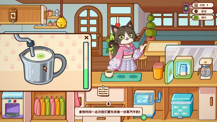 游戏开局是详尽的新手教程,会手把手教导玩家开店中的所有操作,做饮品和甜点并非是硬核做法都是以趣味游戏展开,非常解压。