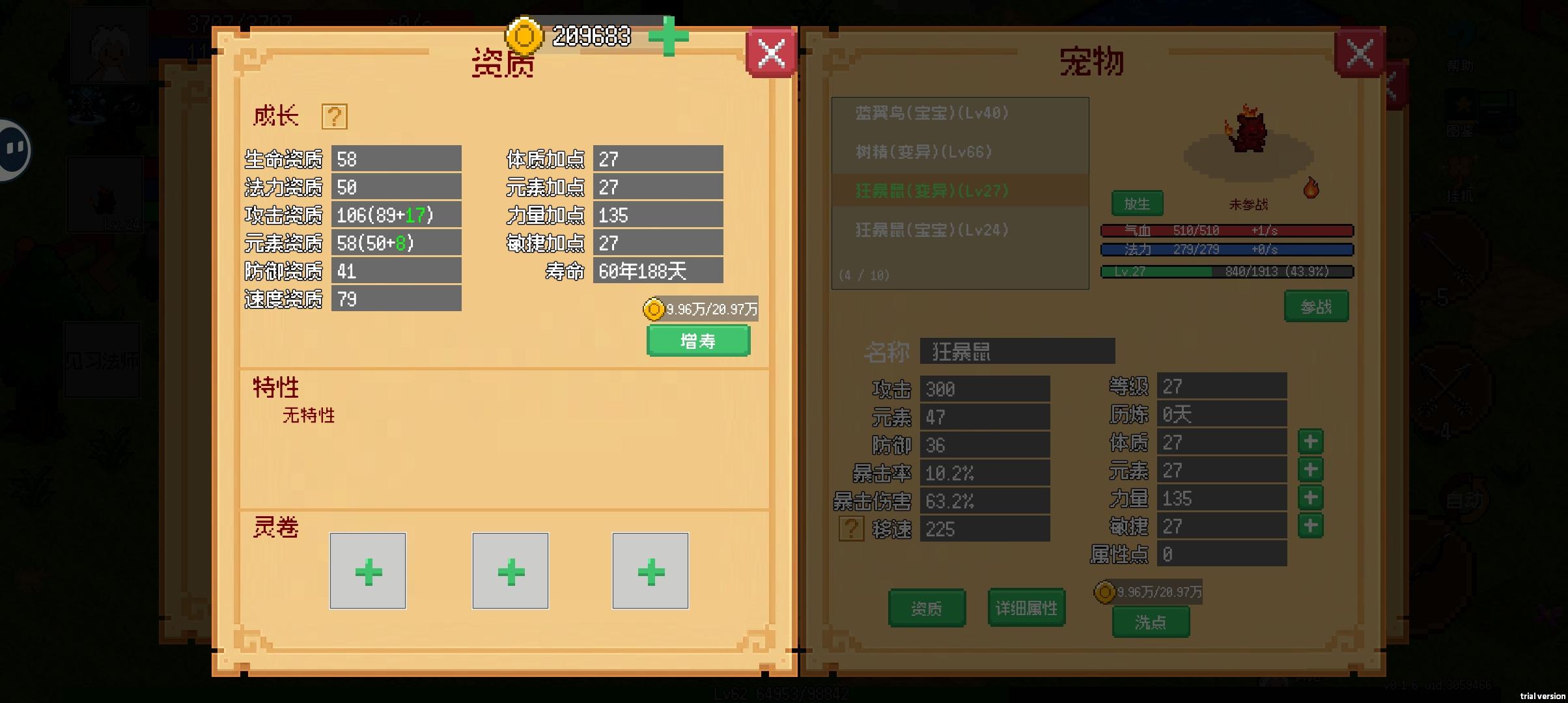 还有个90满攻资质,20攻击的不是变异。搞点宠物卷轴洗洗就好了。宠物格子加到30好点,10个满的太快了。