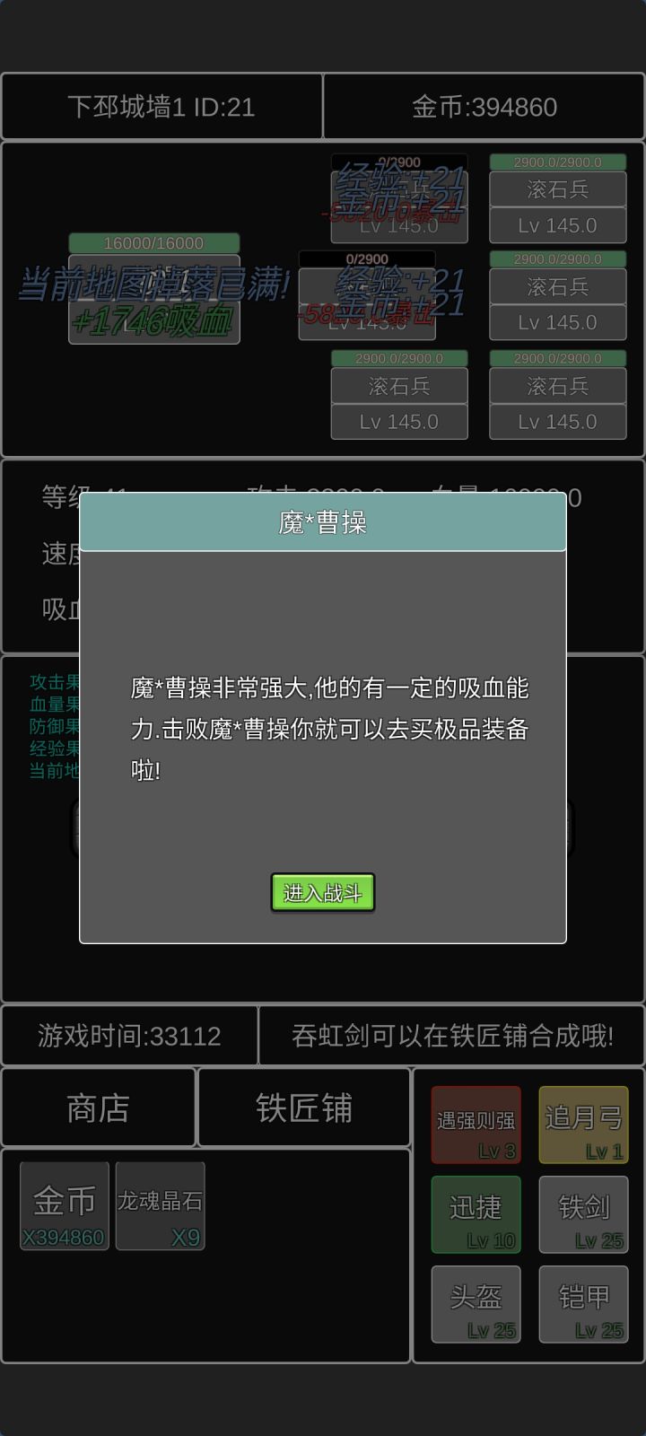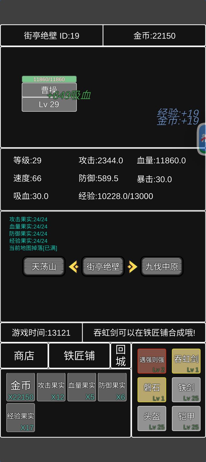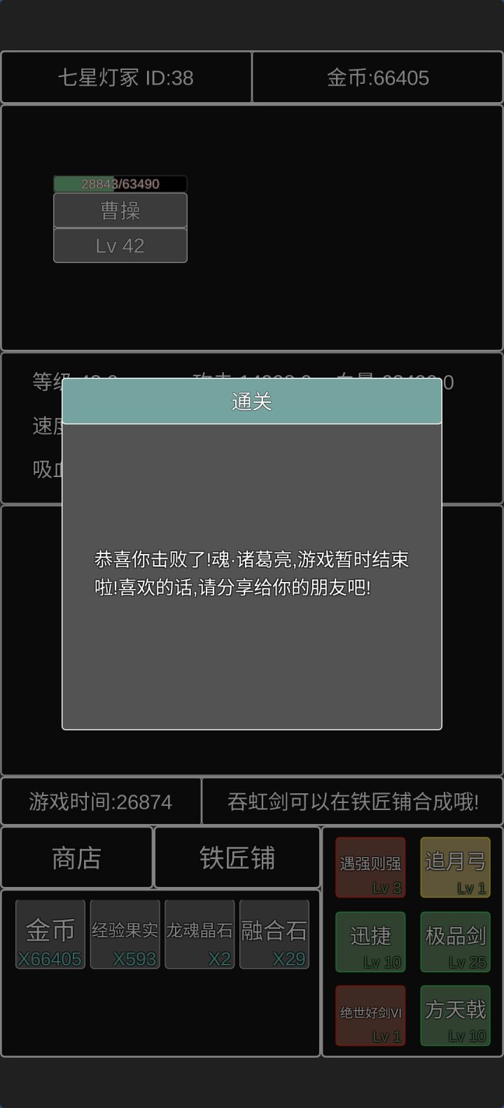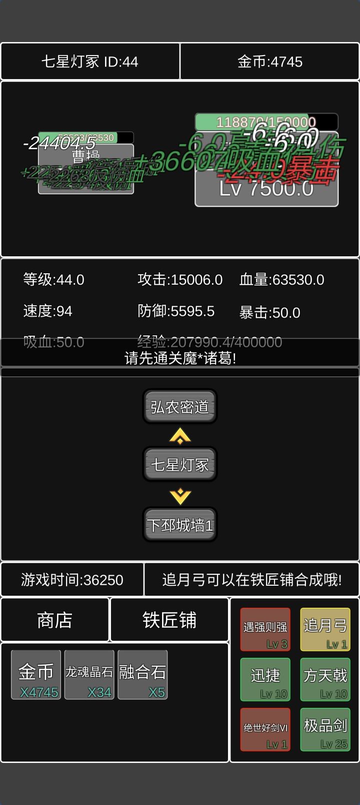 第一阶段boss魔曹操,打不过的看看分享图片,参考参考。就可以打过了。这个游戏有个好处,就是可以打不过boss,可以先继续打后面关卡,先刷属性丹。