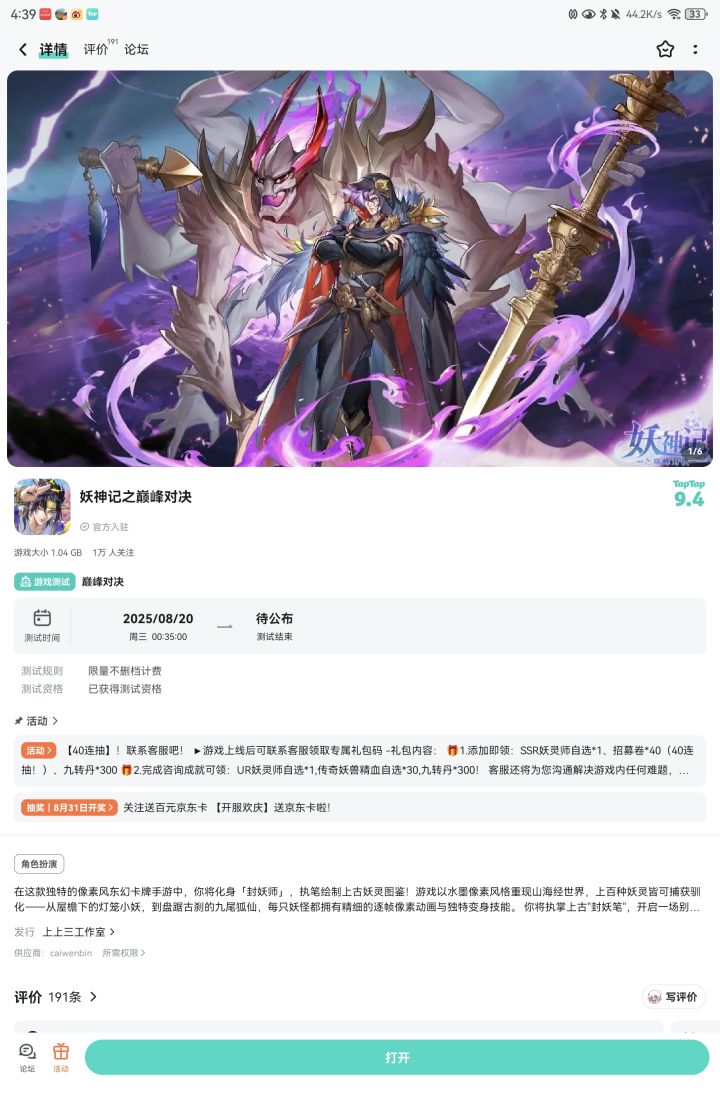 收集百妖,重走聂离逆天改命之路!【京东卡抽奖活动】▶ 参与方式点击关注《妖神记之巅峰对决》并发新帖晒截图 2.在本帖下方评论区分享发帖链接即可【奖品发放】到达开奖时间后,由taptap系统随机抽取符合要求的幸运玩家,自动发放兑换码(对于同一账号大量故意发布评论刷楼层导致其他玩家中奖概率降低的行为的用户,将会可能被取消参与资格!)▶ 活动奖励 活动结束后将抽取1位幸运儿获得1张100元