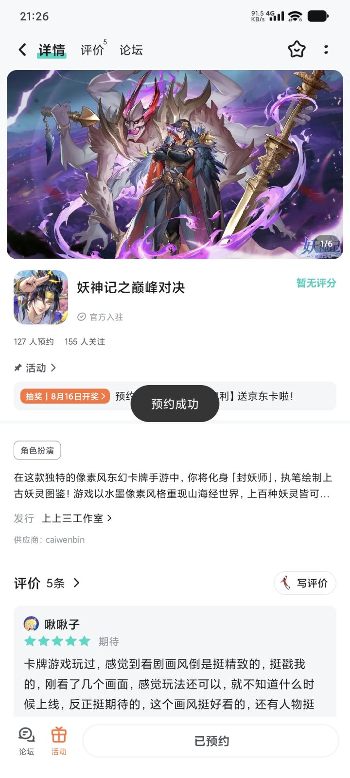 收集百妖,重走聂离逆天改命之路!【京东卡抽奖活动】▶ 参与方式点击关注《妖神记之巅峰对决》并发新帖晒截图 2.在本帖下方评论区分享发帖链接即可【奖品发放】到达开奖时间后,由taptap系统随机抽取符合要求的幸运玩家,自动发放兑换码(对于同一账号大量故意发布评论刷楼层导致其他玩家中奖概率降低的行为的用户,将会可能被取消参与资格!)▶ 活动奖励 活动结束后将抽取1位幸运儿获得1张100元