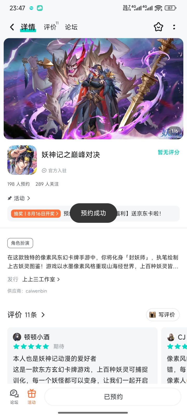 收集百妖,重走聂离逆天改命之路!【京东卡抽奖活动】▶ 参与方式点击关注《妖神记之巅峰对决》并发新帖晒截图 2.在本帖下方评论区分享发帖链接即可【奖品发放】到达开奖时间后,由taptap系统随机抽取符合要求的幸运玩家,自动发放兑换码(对于同一账号大量故意发布评论刷楼层导致其他玩家中奖概率降低的行为的用户,将会可能被取消参与资格!)▶ 活动奖励 活动结束后将抽取1位幸运儿获得1张100元