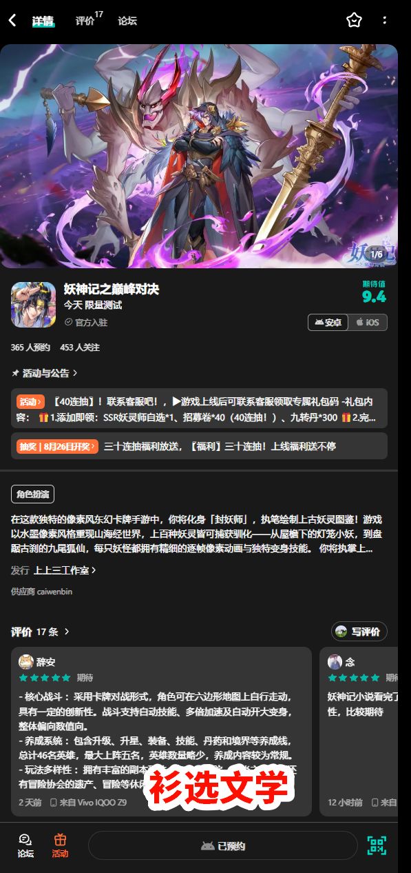 抽卡!抽卡!招募卷不停放送!▶【参与抽奖活动】1.点击关注2.回复本帖关注截图【奖品发放】到达开奖时间后,由taptap系统随机抽取符合要求的幸运玩家,自动发放兑换码(对于同一账号大量故意发布评论刷楼层导致其他玩家中奖概率降低的行为的用户,将会可能被取消参与资格!)▶ 【客服奖励】🎁1.添加即领:SSR妖灵师自选*1、招募卷*40(40连抽!)、九转丹*300🎁2.完成咨询成就可领