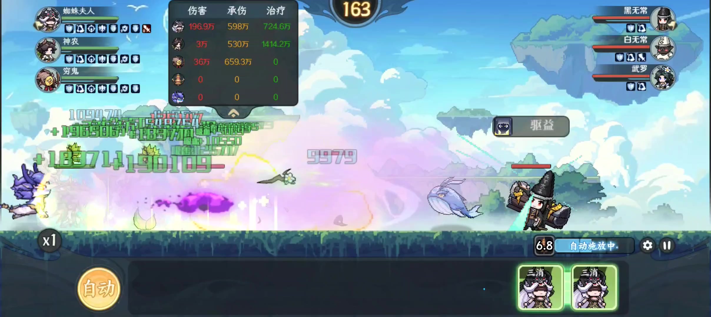 大家好,我宣布这是本游戏目前最好看的角色没有之一!话不多说先看下面的实战数据可以看出蜘蛛夫人在两队一起打boss的环境下是甩开九尾狐很远的,最关键就是来自她核心技能的造块能为自己与孙悟空稳定造块使得孙悟空能稳定触发追击技,不会像携带其他三消角色遇到卡块的情况,核心技造两个块的高产也是大大提升了阎罗的输出。在星级升到4星解锁3级核心技时个人认为是最强的一个阶段,高频率的三消无视技能冷却,达到与回蓝