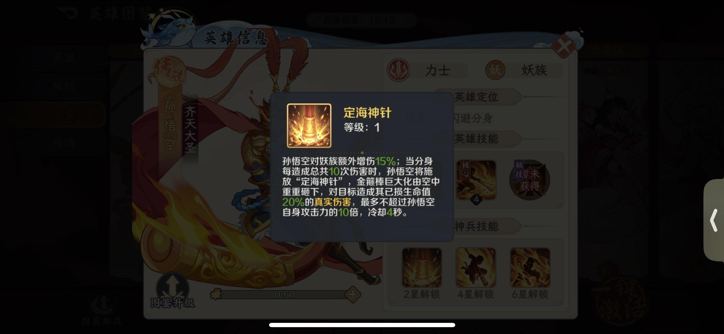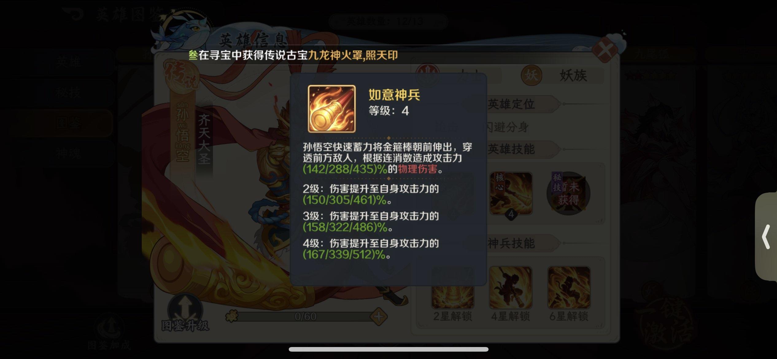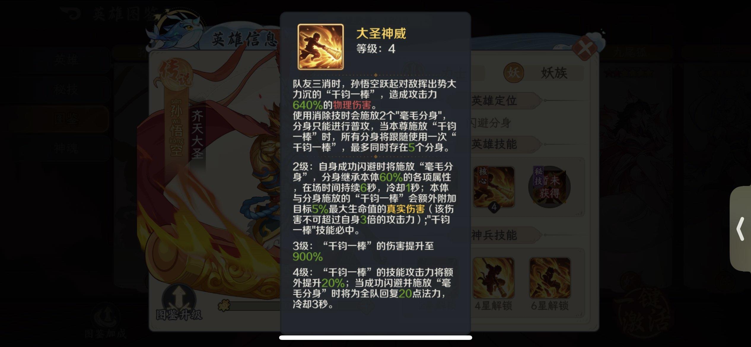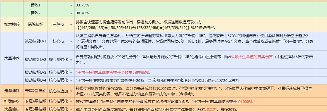 如意神兵:孙悟空快速蓄力将金箍棒朝前伸出,穿透前方敌人,根据连消数造成攻击力【(142/288/435)*(150/305/461)*(158/322/486)*(167/339/512)】 %的物理伤害。大圣神威:被动技能LV1:队友三消后自身再任意消时,孙悟空将会跃起对敌挥出势大力沉的"千钧一棒",造成攻击力670%的物理伤害;使用消除技时孙悟空会施放2个"毫毛分身",分身继承本体60%的