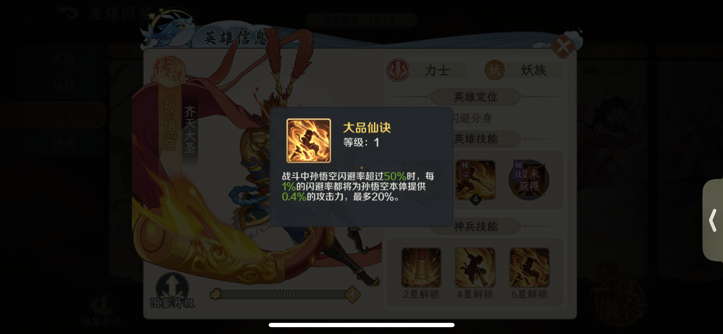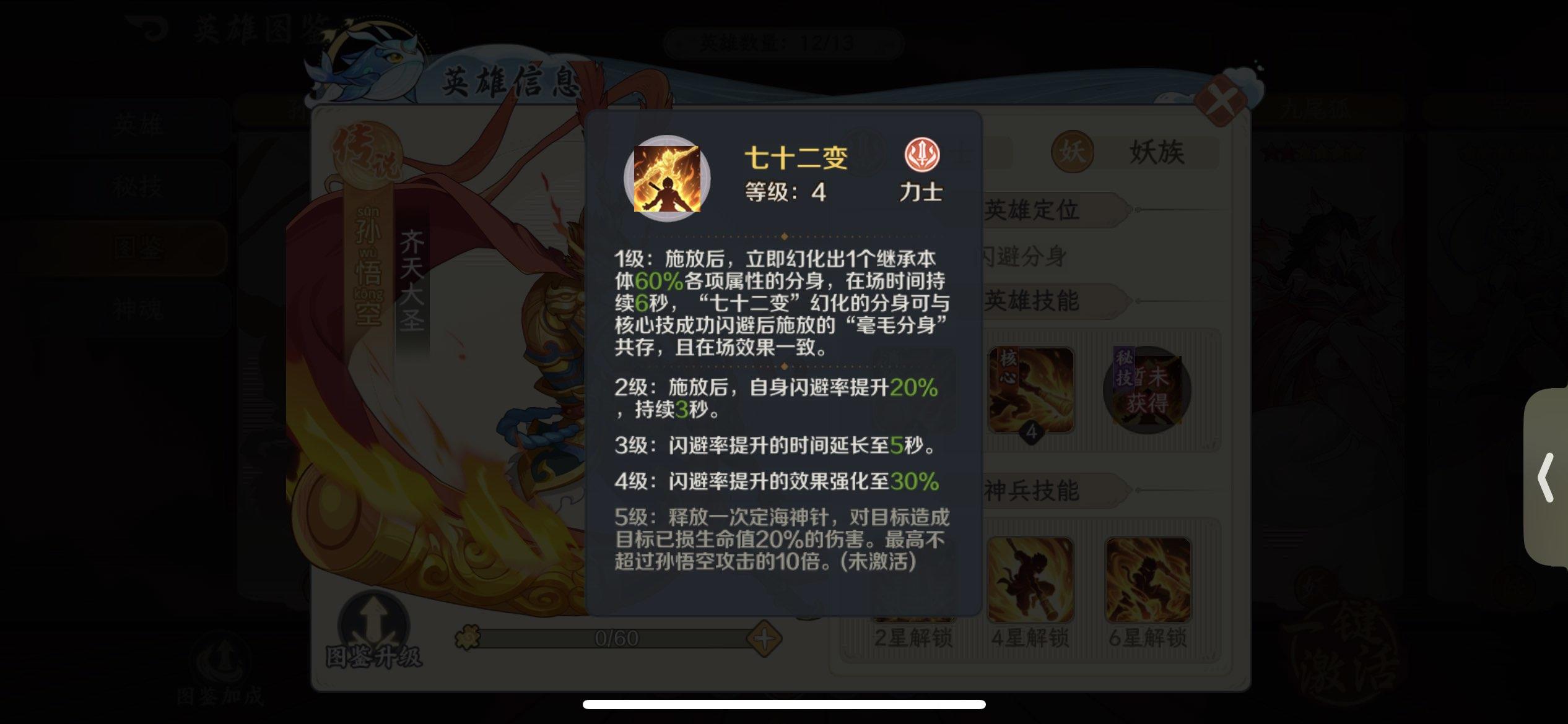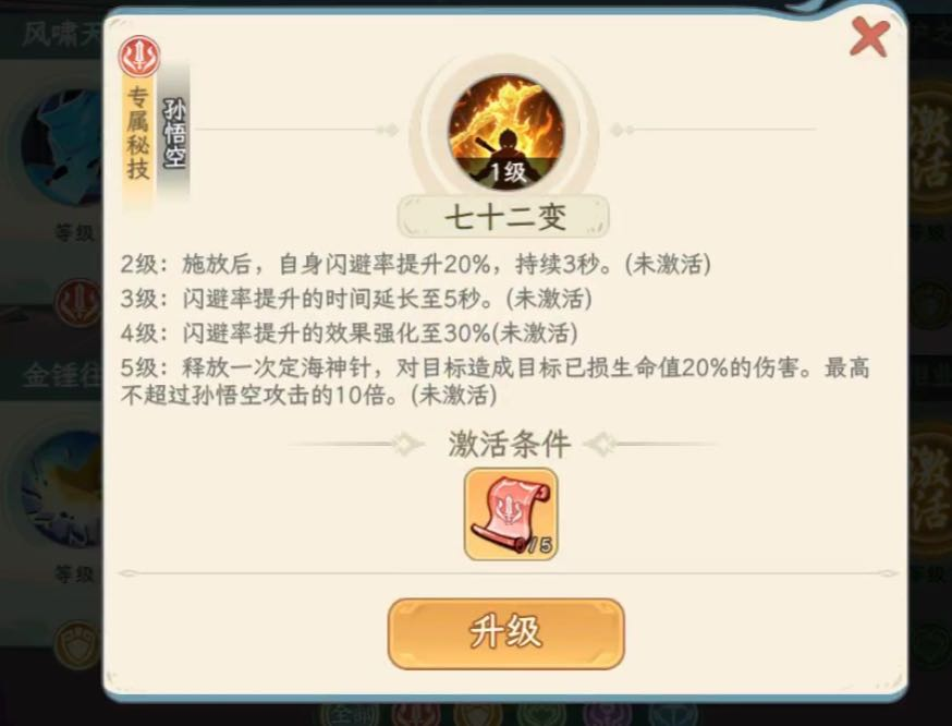 如意神兵:孙悟空快速蓄力将金箍棒朝前伸出,穿透前方敌人,根据连消数造成攻击力【(142/288/435)*(150/305/461)*(158/322/486)*(167/339/512)】 %的物理伤害。大圣神威:被动技能LV1:队友三消后自身再任意消时,孙悟空将会跃起对敌挥出势大力沉的"千钧一棒",造成攻击力670%的物理伤害;使用消除技时孙悟空会施放2个"毫毛分身",分身继承本体60%的