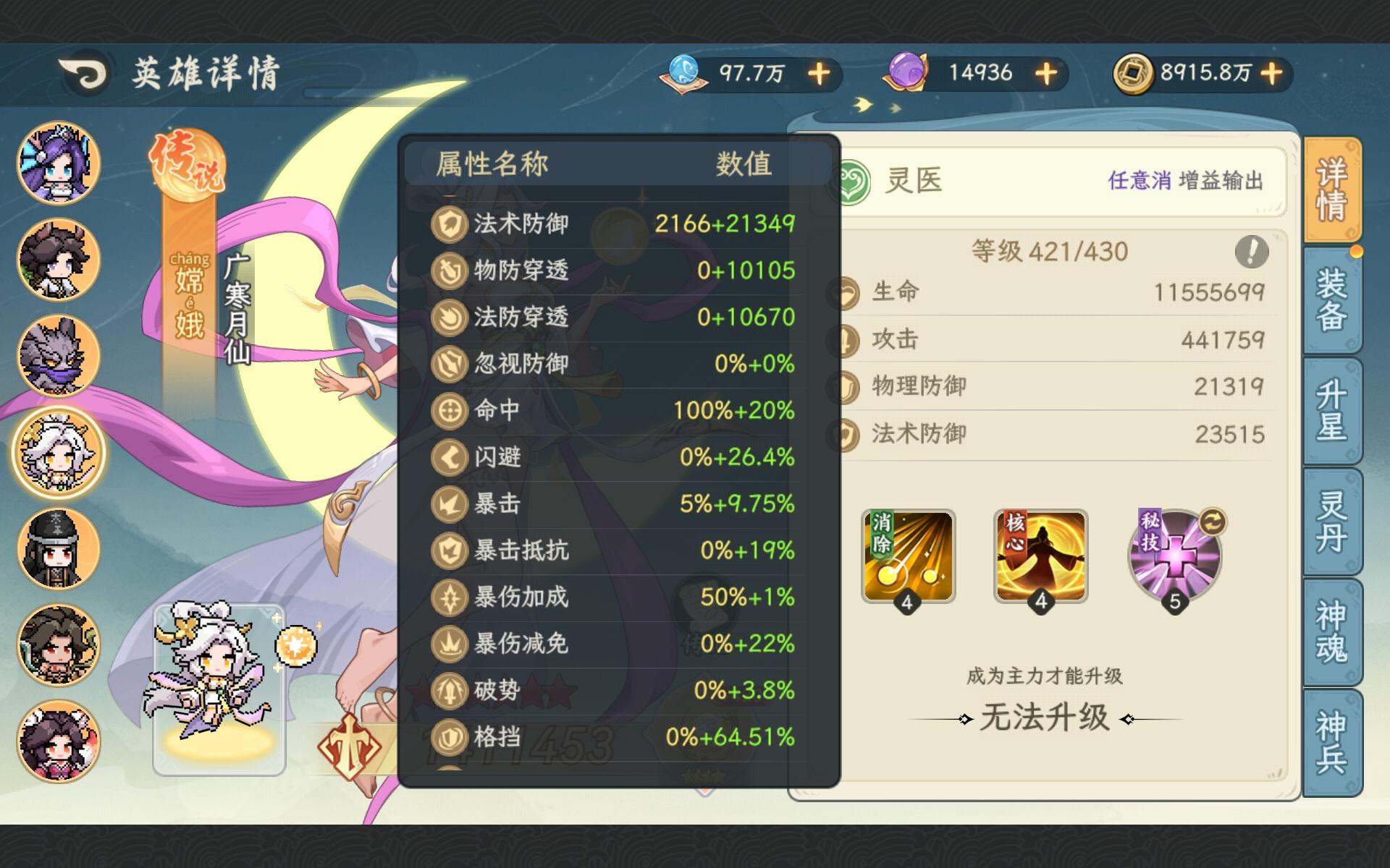 目前格挡不到65%,红色格挡肯定不好刷新,橙紫色能用就行,把闪避换掉有点不舍,好不容易才能洗出来。等过了800层,给嫦娥闪避神魂套装和九尾组队再加上闪避减伤麒麟,神兵另外一条也洗闪避,斗法小分队应该还能靠得住吧?798的大宝剑战力不够的话,格挡再高点估计也扛不住,我嫦娥神兵才+4(没办法上轮锻造比较歪,抽了4轮才凑够+4),等下周锻造+6后战力上去了应该就能扛过吧