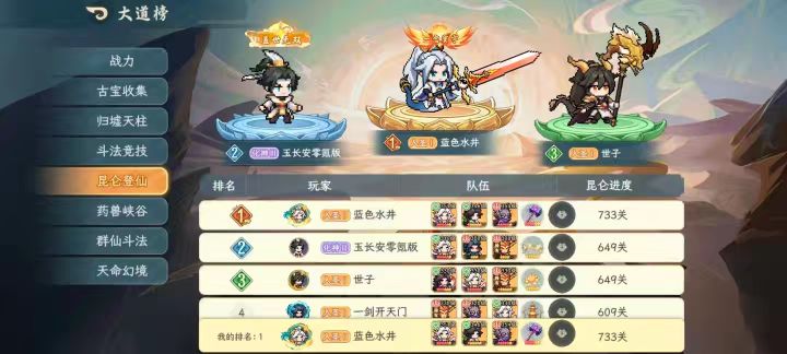 昆仑登仙出800层已经有一阵子,我是今天好不容易爬到800的,然后工会的小伙伴都想知道怎么爬的轻松,然后让我出份攻略,那我就试试,尽可能的帮助大家早日800层。首先,800层强度还是挺高的,所以必须的练度一定要有,怎么实验你练度达标呢,上个神农(我武罗练度不够,推荐武罗,武罗是农的上位替代)神器带紫雷锤,其他配置之后也会有说明,爬普通层数的时候能稳定满血通过,那么你的练度就已经够了,努力的向着8
