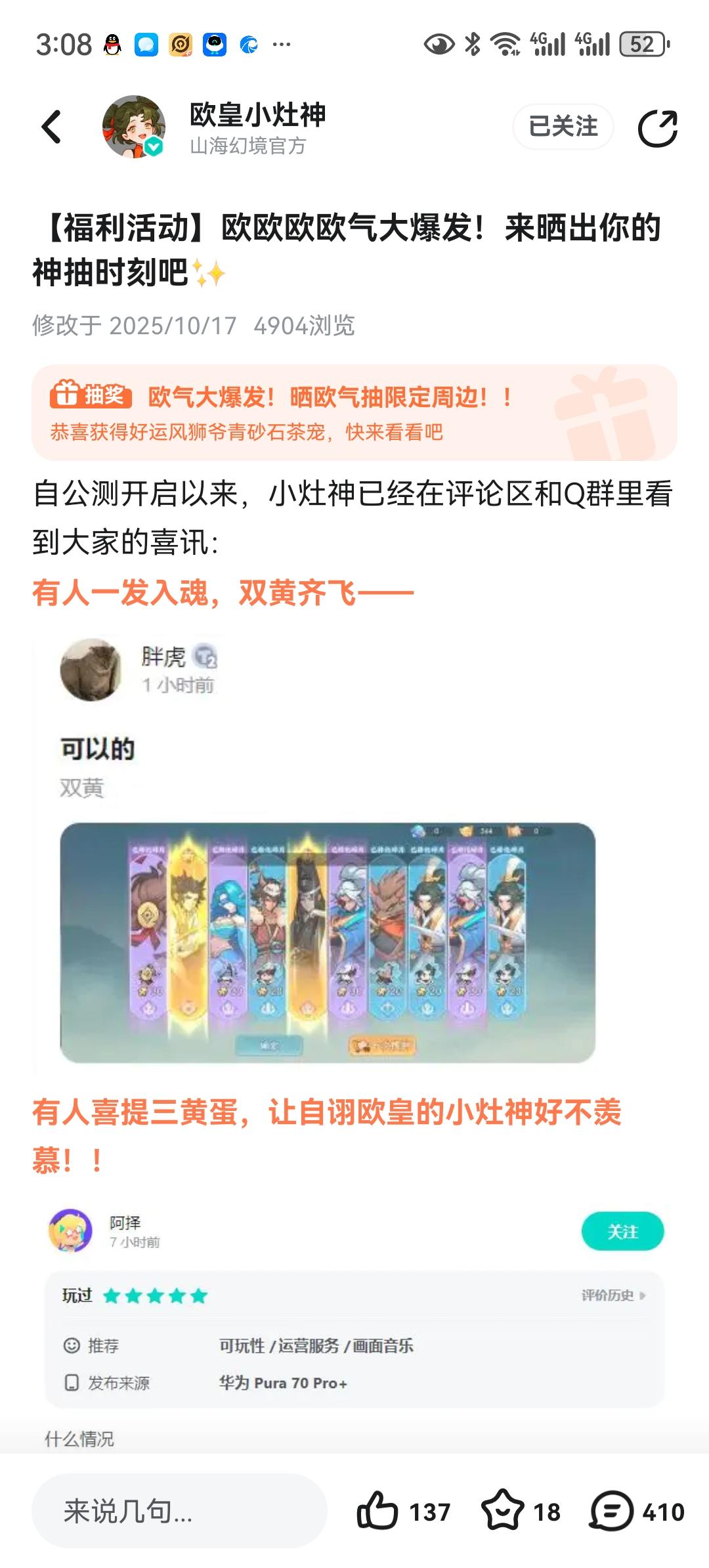 【福利活动】欧欧欧欧气大爆发!来晒出你的神抽时刻吧✨https://www.taptap.cn/moment/728276826698286211?share_id=6c630eb18e16&utm_medium=share&utm_source=copylink这个奖品还发吗?之前说发到现在没见到#山海幻境 #山海幻境攻略 #山海幻境公测