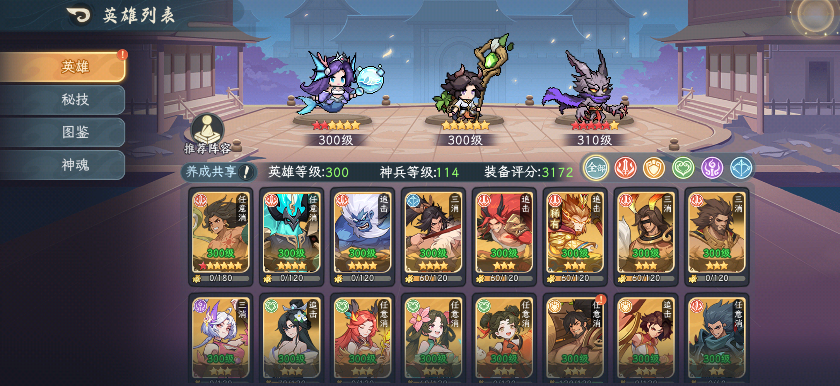 大家好,这期给大家带来齐天大圣孙悟空的pve测评,这次推出新人物也加强了九尾狐的技能,想让孙悟空跟九尾狐绑定在一起,因此配队为孙悟空+九尾狐+阎罗,九尾狐妖族增伤机制跟造块契合这两大C,在孙悟空6星神兵之前九尾狐只需要4星人物即可上场。为了测试的准确性,我用了以下的阵容(不单减任一防御效果) 测试星级神兵配置为: 犼+嫦娥+鱼(均为12+6) 孙悟空(10+4)+九尾狐(12+6)+
