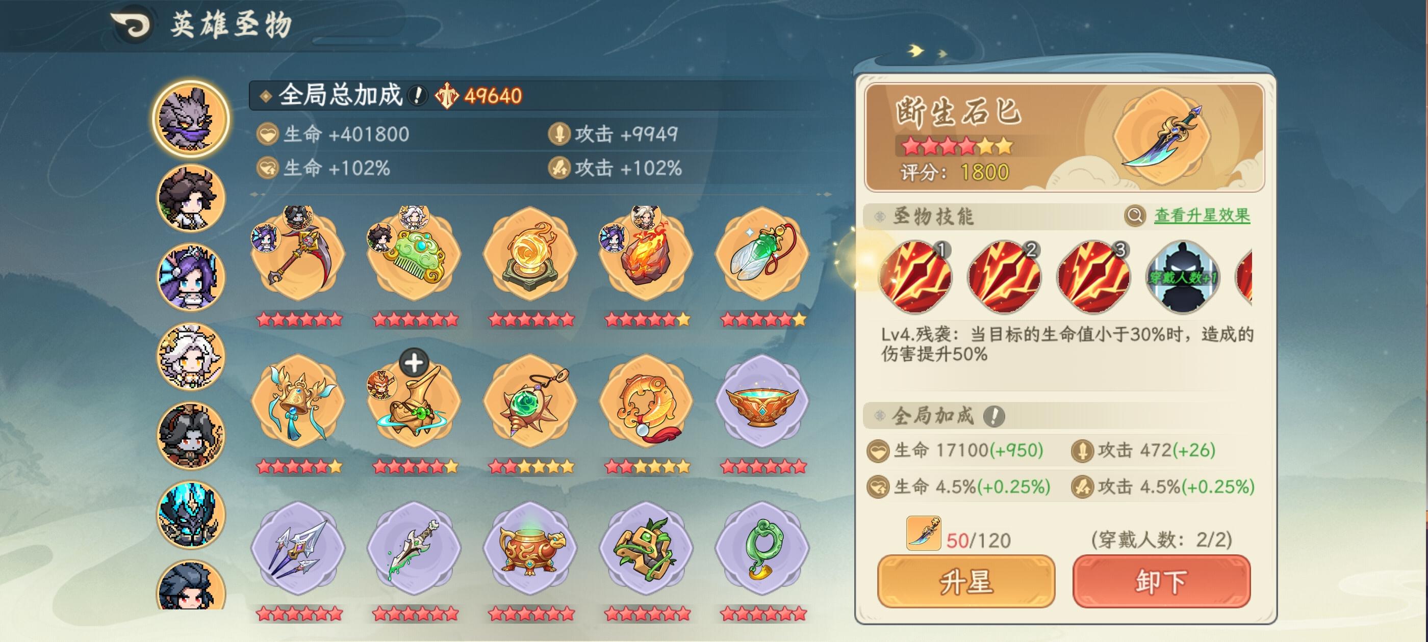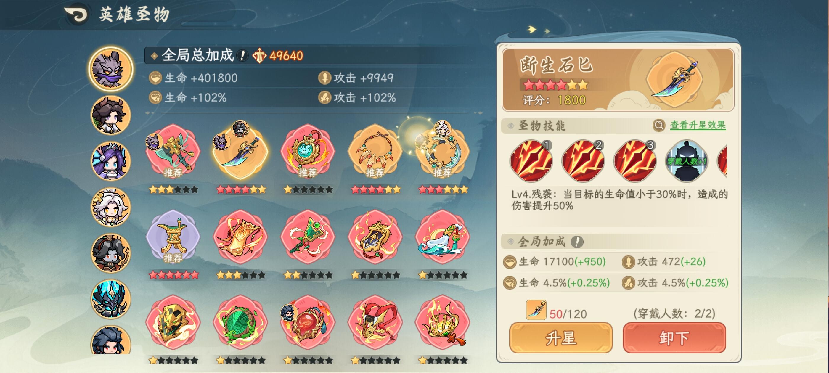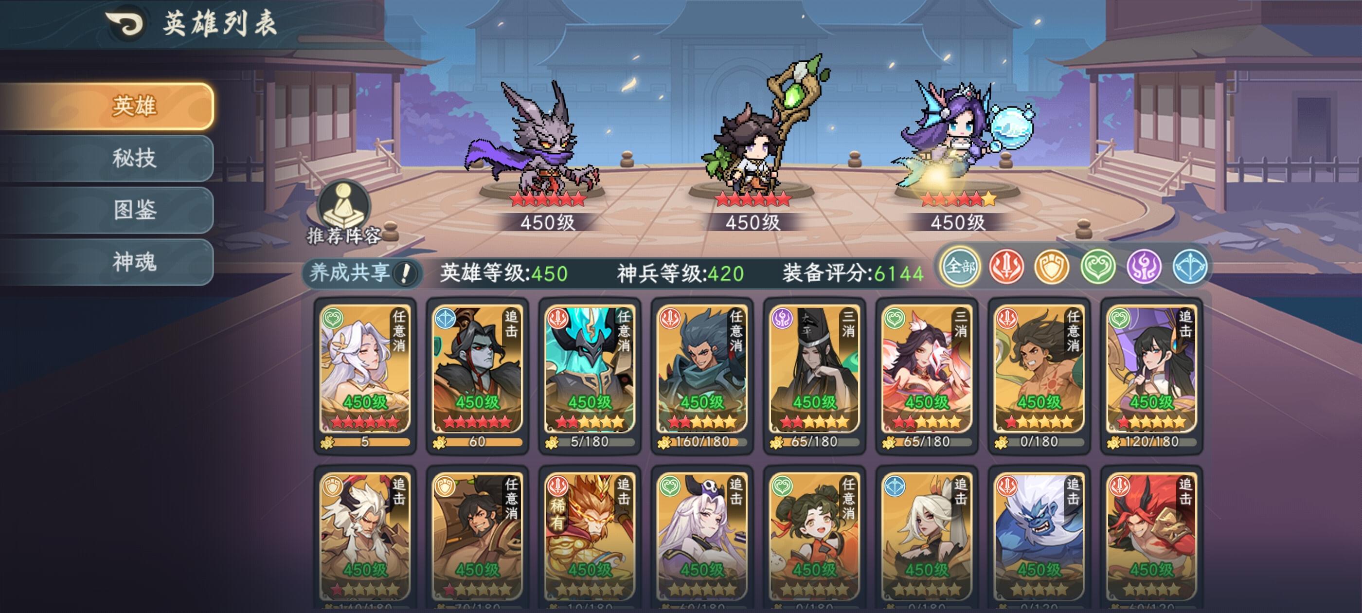 昆仑登仙出800层已经有一阵子,我是今天好不容易爬到800的,然后工会的小伙伴都想知道怎么爬的轻松,然后让我出份攻略,那我就试试,尽可能的帮助大家早日800层。首先,800层强度还是挺高的,所以必须的练度一定要有,怎么实验你练度达标呢,上个神农(我武罗练度不够,推荐武罗,武罗是农的上位替代)神器带紫雷锤,其他配置之后也会有说明,爬普通层数的时候能稳定满血通过,那么你的练度就已经够了,努力的向着8