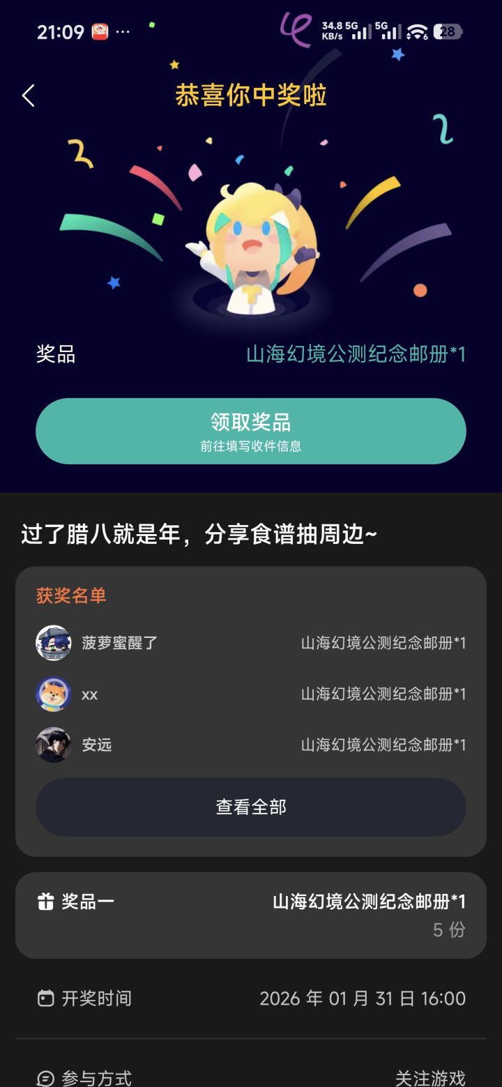 谢谢山海幻境官方,连续中奖两次,第一次是蜘蛛夫人的3000元宝,第二次是腊八粥的周边实物