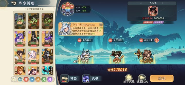 五:天门祈愿第二天会开启天门祈愿建议大家不要抽取,神兵会在第三天加入这里。抽取建议为:阎罗神兵-嫦娥神兵-阎罗本体六:灵宠只推荐麒麟与青龙,前期最好的情况就是一队携带麒麟,另一队练度低的携带青龙,在两队都成型后再对比伤害携带麒麟。七:二队培养在第四天的世界boss相柳就会开启两队讨伐,这时都有up人物活动送的孙悟空 蜘蛛夫人的本体,多up搜神卷拿去抽孙悟空即可,下面是配队推荐0氪or