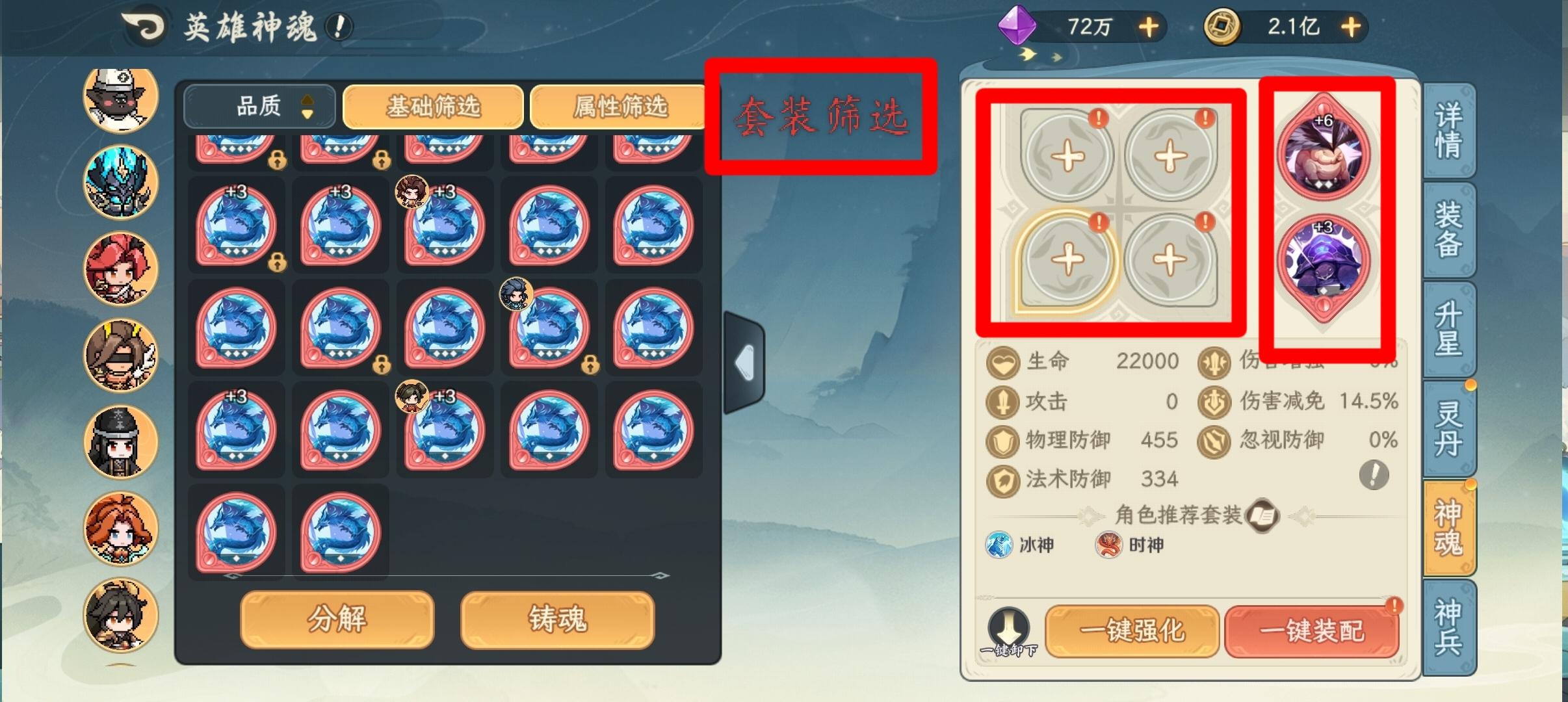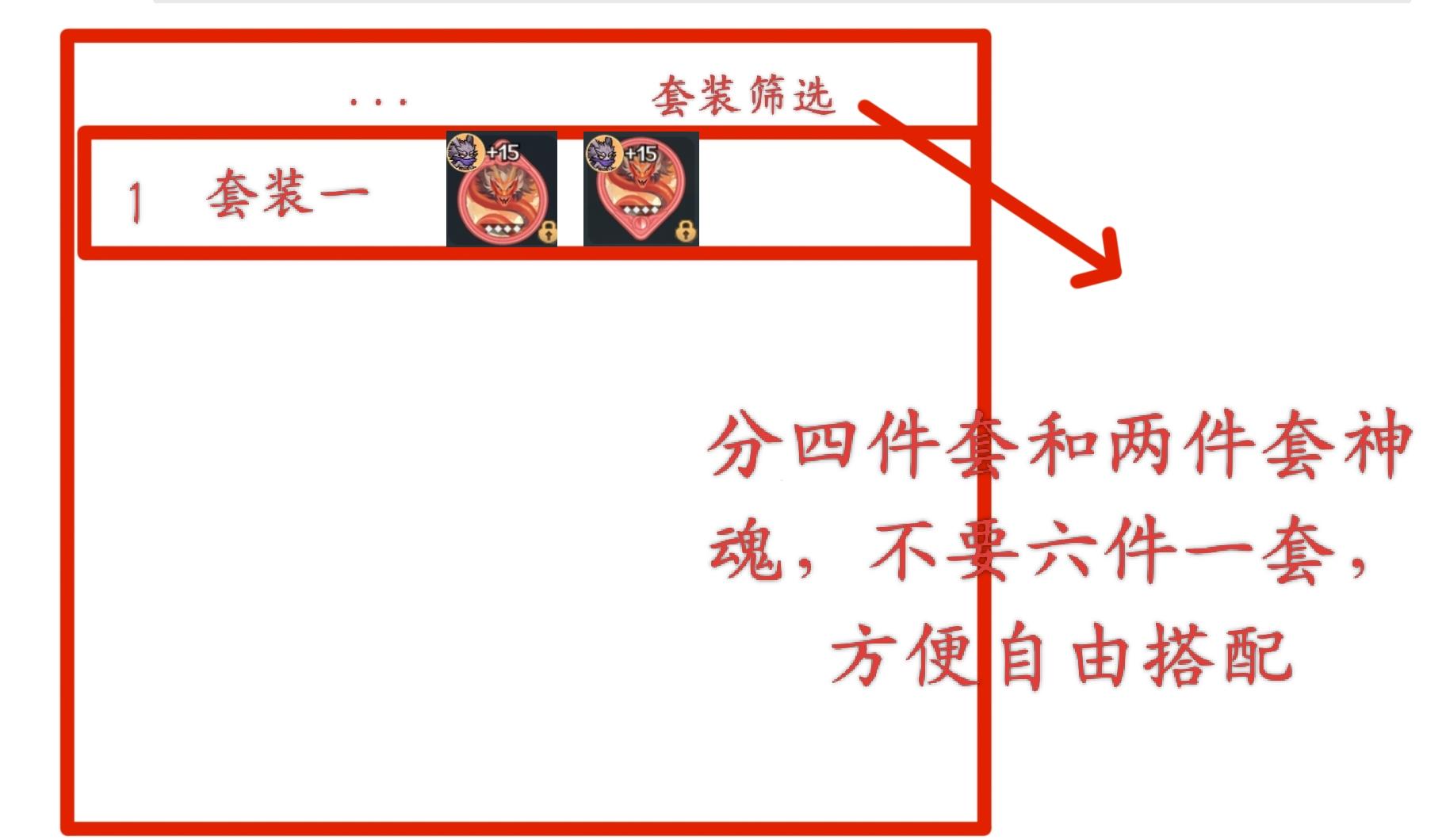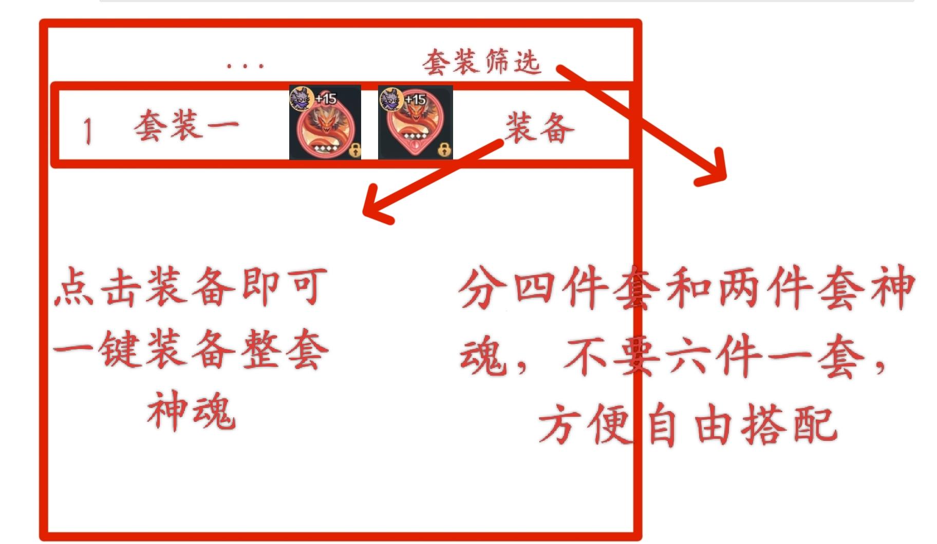 替换神魂需要一个个换,不同活动或不同阵容时要经常更换神魂更是繁琐的不行,游戏体验极差且糟心,建议优化。简化操作让玩家更多时间在于体验游戏上,而不是经常要糟心地进行无聊繁琐操作里p1,加个套装选择,分为四件套和两件套神魂,点击四件套进入四件套选择界面,点击两件套进入两件套界面p2~p4,可以保存20套神魂,序号1,2,3...固定,套装名字可自定义。(序号方便寻找,名字方便区分)p5,点击装