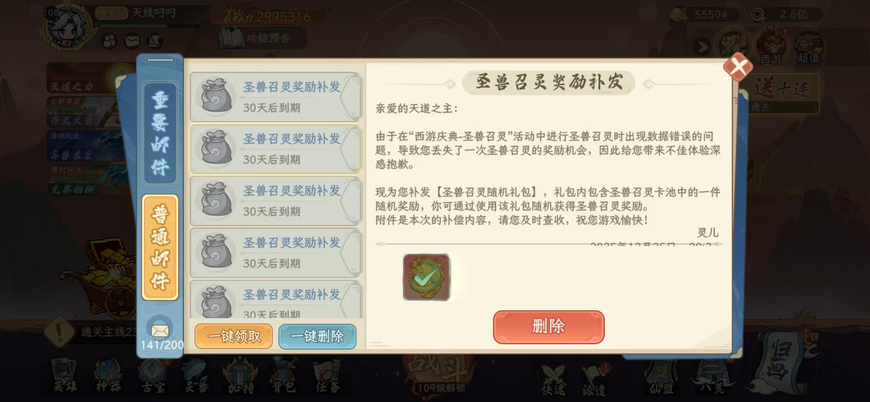 目前有少部分玩家收到了多份圣兽召灵奖励补发邮件,极少部分玩家已领取邮件(20人左右)。接下来会在24小时内定位问题原因,并对多发资源进行回收处理。为以防更多玩家误领邮件,我们会先暂时关闭邮件领取功能,待错误邮件回收完毕后会立刻开启,不影响您继续领取邮件资源,还请知悉~