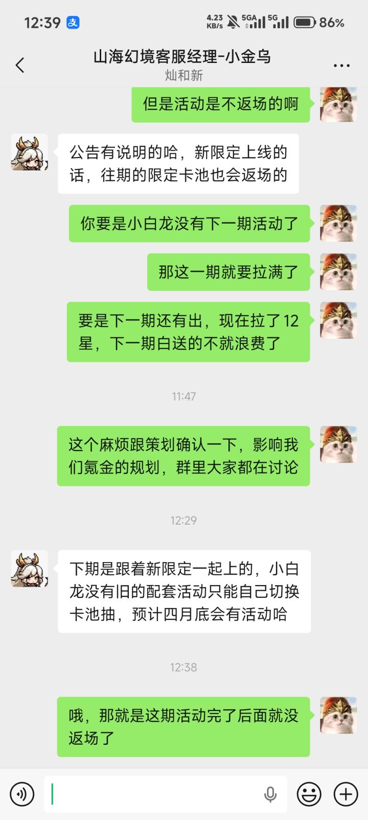 咨询了客服,4月底出新限定,小白龙的卡池还有,可以用券抽,但是没有签到奖励和商店兑换这些了,要变成新限定的奖励。有条件的本期就多拉一些吧,下期就要抽新限定了,如果差一点可以下期卡池抽再补