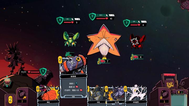 《狂星滥炸》中的玩家每回合从卡组中抽取卡牌并打出,以此来对敌人造成伤害或者给自己叠甲,随着冒险的进行还会解锁更多机制的卡牌,比如各种BUFF和DEBUFF。而敌方则是不打牌的,直接使用技能或者普攻进行战斗,但我们可以提前看到他们下回合的行动意图,这样的设定和很多同类型游戏有这共通之处。