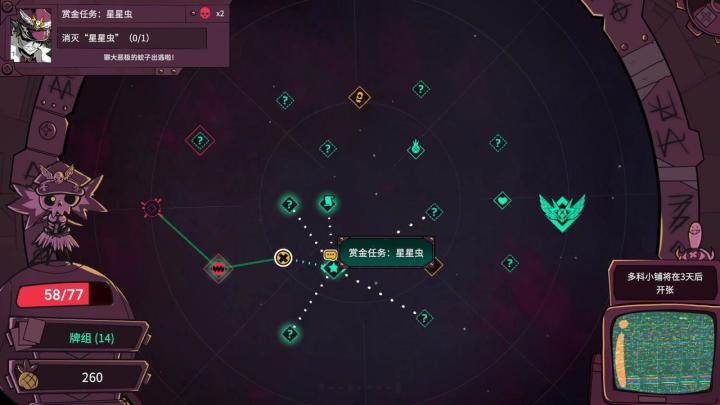 在冒险中我们可以接取一些支线任务,比如消灭当前地图中的某个敌人或者星球,有时候是占领某个星球。如果是占领某个星球的任务,我们就必须注意不能把那个星球摧毁了,而是通过将其“人口”塞满的方式将其占领。完成支线任务可以获得比较丰厚的奖励,包括卡牌效果组件(可以嵌入到已有的卡牌上)、新的宝物(战斗中自动生效)、菠萝(本作的金币单位,可以在商店购买卡牌或者删除卡牌)。