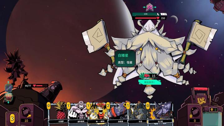 战斗的时候还有一个值得一提的机制,就是融合。《狂星滥炸》中有大量的卡牌是可以二合一的,在打牌的时候可以不耗费任何代价将手牌里的两张可融合卡牌合成一张新卡。融合的产出卡牌,其效果不一定是两张融合素材效果的叠加,有时候甚至毫不相干的新效果,但又有一定的规律可行,但好在多打几局就可以理解。卡牌打出的时候需要消耗对应的费用,费用上限固定且每个回合开始的时候会自动回满,这个是很多卡牌对战游戏都有的经典设定,就不赘言了。