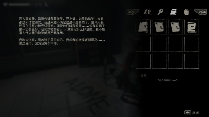 战斗是为了让我们能在小镇里更好地探索,探索的目的一是寻找主线任务需要的剧情道具,以及补充手电筒电量的电池和恢复萨莉血量的吸入器(这个设定应该是暗示萨莉在现实中是一个哮喘患者),另一个目的就是收集与剧情相关联的各种收集品,比如各种日记本。这些剧情收集品其实是本作碎片化叙事的载体,玩家通过它们来了解一个完整的故事。虽然本作的剧情并不难猜,各种设定和暗喻其实都非常好理解,但这些叙事碎片能让玩家更深入地了解本作人文关怀的主旨。