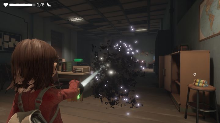 另一种选择就是使用手电筒与怪物战斗。在本作中,手电筒被赋予了武器的作用,萨莉使用手电筒的时候有不止一种的攻击方式:可以通过蹲下潜行绕到怪物身后,以手电筒作为近战武器背刺怪物,这种攻击是一击致命的,可以秒掉怪物;如果无法绕后,还可以使用手电筒的光线照射怪物的弱点,当照射弱点的时间到达一定程度时就会对其造成击破效果,击破怪物身上的所有弱点之后怪物就会被消灭;而如果被多只怪物围攻,还可以使用手电筒的闪光功能让怪物短暂致盲,萨莉就可以趁机脱身。