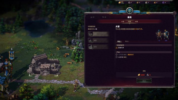 《征服之歌》这款游戏的策略性是比较丰富的,这一点体现在游戏系统的设计上。在大地图中,我们可以经营自己的基地,建造各种建筑,比如兵营用于训练士兵,这样我们在战斗中减员也不用担心,可以回兵营花资源再训练兵力进行补充,兵力的训练是以回合为时间单位的;各种资源产出型的建筑则为我们提供持续的资源供应,比如矿山会每个回合有金币产出。建筑的合理安排与升级会在战斗之外为我们提供强大的后勤保障,以及科技的支持。