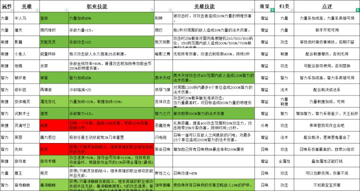 玩游戏一个月,总遇到一些萌新问哪些英雄可以ban,哪些英雄进化保留,哪些技能好用,技能不认识抉择币用了也不知道选谁。为了让萌新可以快速了解职业技能,下面对英雄进行分类。也欢迎各位大佬互相讨论,耗时较长,不喜勿喷。内容较多,耐心观看。割:-———分界线————1、首先目前更新了70位英雄图鉴和3个隐藏英雄。主属性分为力量、敏捷、智力。当主属性为力量时,每点力量额外增加1点攻击力,当主属性为敏捷时