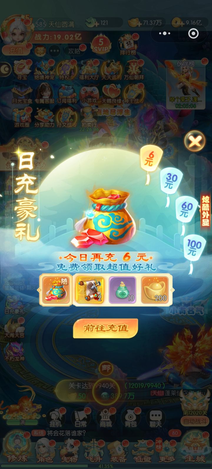 佛系玩家主打佛系,薅羊毛不是不行,主要是玩得没那么轻松愉快!如果有月卡(或者至尊卡),会比较轻松,解放双手可以挂机快速跳过战斗,早买早轻松! 冲榜是很多人的乐趣所在,总共有10多个榜,并且是轮回重复的活动。所以冲榜活动最关键的一个字就是:屯。尤其是佛系党和月卡党! 许多玩家喜欢用元宝买材料,如果每一期都买其实是很浪费的。元宝买的材料通常是不足以拿到第一,所以一定要屯材料和元宝。新手都有一个习惯