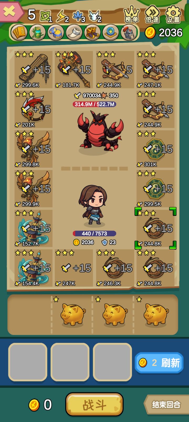 (无敌阵容攻略)无敌阵容。可以一直转圈连下去。有点无聊了。红圈是无限转圈的阵容。非红圈的换其他加伤害的。可以换成塔或者弩箭。或者其他加伤害的。让他打得更快。原理是绳子生成金猪,而弩箭可以消耗金猪。从而形成左脚踩右脚。如果是火筒枪的话会因为生成4葫芦而停下来。塔是加伤害的。后期加血和加血上线没什么必要。boss一下就可以把玩家秒了。