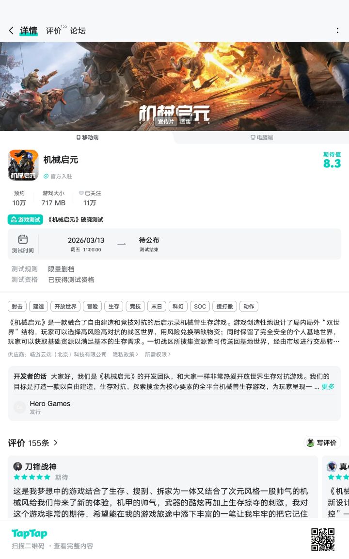 各位先驱者:机械启元破晓测试已于11点正式开启,各位先驱者开始生存之旅了吗!游戏目前还处于测试阶段,会存在很多不完善,需要优化的地方,也希望各位先驱者在游戏体验过程中,把遇到的问题,体验不好的地方都反馈给我们,我们会逐一查看分析,并在后续版本中进行优化,大家携手一起共建更加良好的游戏环境。建议收集问卷:BUG收集问卷:
