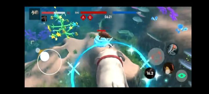 开始前可以在几种动物中任选一只开始游戏,每个动物三个技能,有较大差异化。游戏开始后是第三人称视角,类似水下的3D世界,像潜水的感觉。正面对敌可以发起攻击造成伤害,有主动技能可以使用,有一定学习成本。