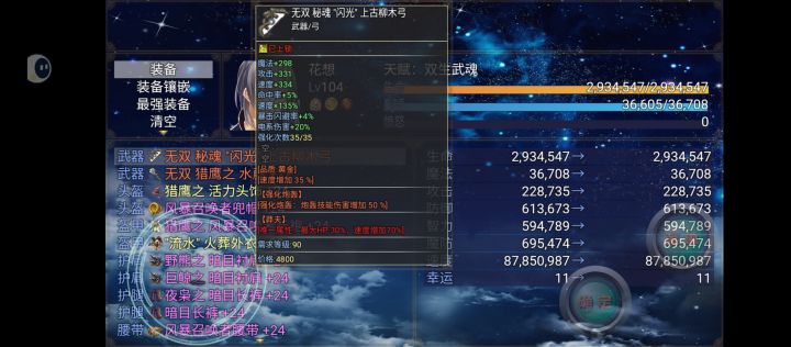 无敌啊,之前玩无限精炼也没这么猛的面板。才101级,还能提,武器还没精炼。只sl出来一把柳木弓。再sl一把柳木弓还能提百分之35速。项链鞋子还能提基础。坐骑和另外一个啥玩意儿装备我还没带,还能提两个百分之20,140的头有加攻击百分比不知道有没有加生命的。就是饰品不知哪里爆啊,太看脸了,我几个饰品加攻击和智力都有就是没加速度的。能爆一个饰品的话速度两个小目标问题不大。不知道能不能秒奥赛城boss。