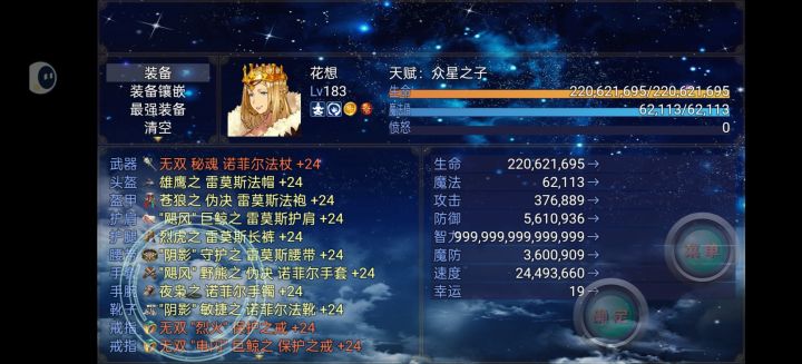 无敌啊,之前玩无限精炼也没这么猛的面板。才101级,还能提,武器还没精炼。只sl出来一把柳木弓。再sl一把柳木弓还能提百分之35速。项链鞋子还能提基础。坐骑和另外一个啥玩意儿装备我还没带,还能提两个百分之20,140的头有加攻击百分比不知道有没有加生命的。就是饰品不知哪里爆啊,太看脸了,我几个饰品加攻击和智力都有就是没加速度的。能爆一个饰品的话速度两个小目标问题不大。不知道能不能秒奥赛城boss。
