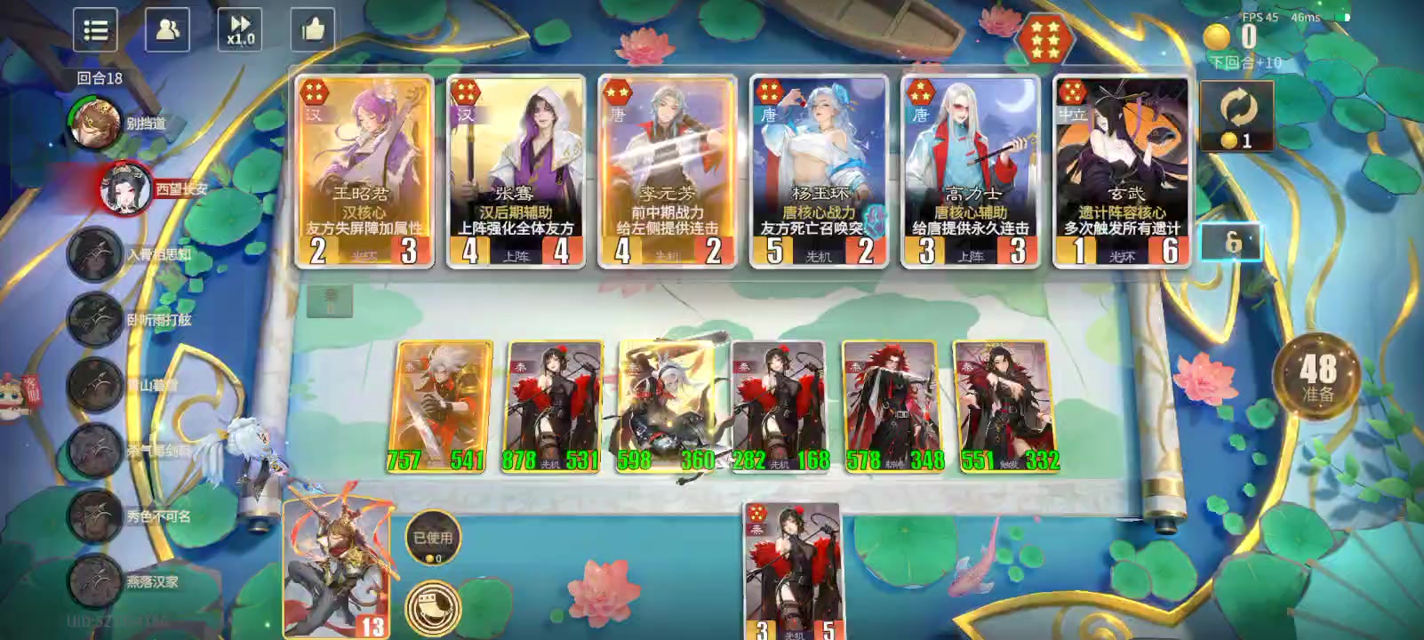 一、阵营特色 唐本身由于【高力士】的存在,后期可以实现全员连击;同时【杨玉环】【李秀宁】【北衙禁军】都可以召唤带有突袭的禁军,从而使唐拥有非常高的攻击频率,进而多次触发鼓舞效果。 【优势】频率高、成长快。尤其是打妖族的时候,能够通过禁军清理大量小妖,同时养成自己。 【劣势】禁军属性低,会帮助秦的【芈月】刷新效果,也会快速养大对面的【李广】或者【秦琼】。 二、关键卡牌 ①核心 ②主力输出 【李白】: