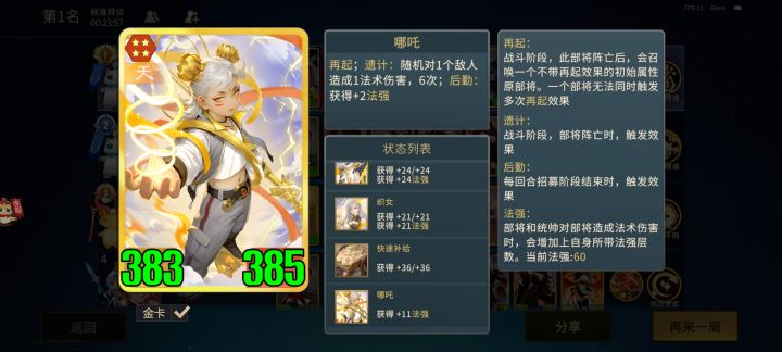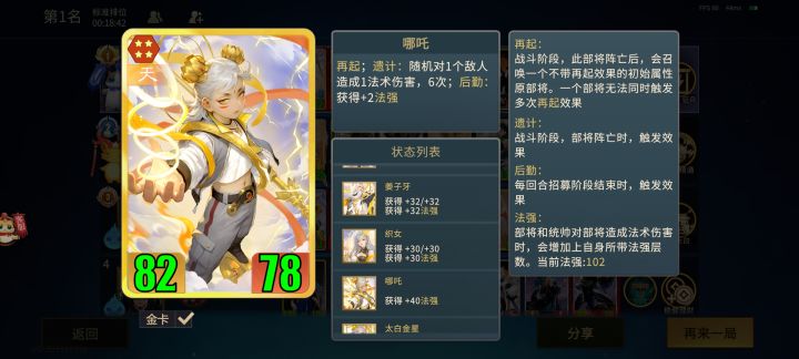 游戏性:很多卡牌相对于市面上的相同类型游戏都做出了特点,游戏的节奏体验下来也很好。部将强度:段位高了后,哪吒这张牌太过超标,极大程度影响了游戏体验,不说别的,就说玩唐的玩家,我7回合双武则天,阵容齐全,但因为有天阵容在,我连续3个回合遇到哪吒,0提升,10回合直接死。除了这个例子外,哪吒这张卡的强度属于是,前期强,中期有点强,后期无敌强,如果能把3次攻击变为2次就可以接受。这样子天阵容才需要找李