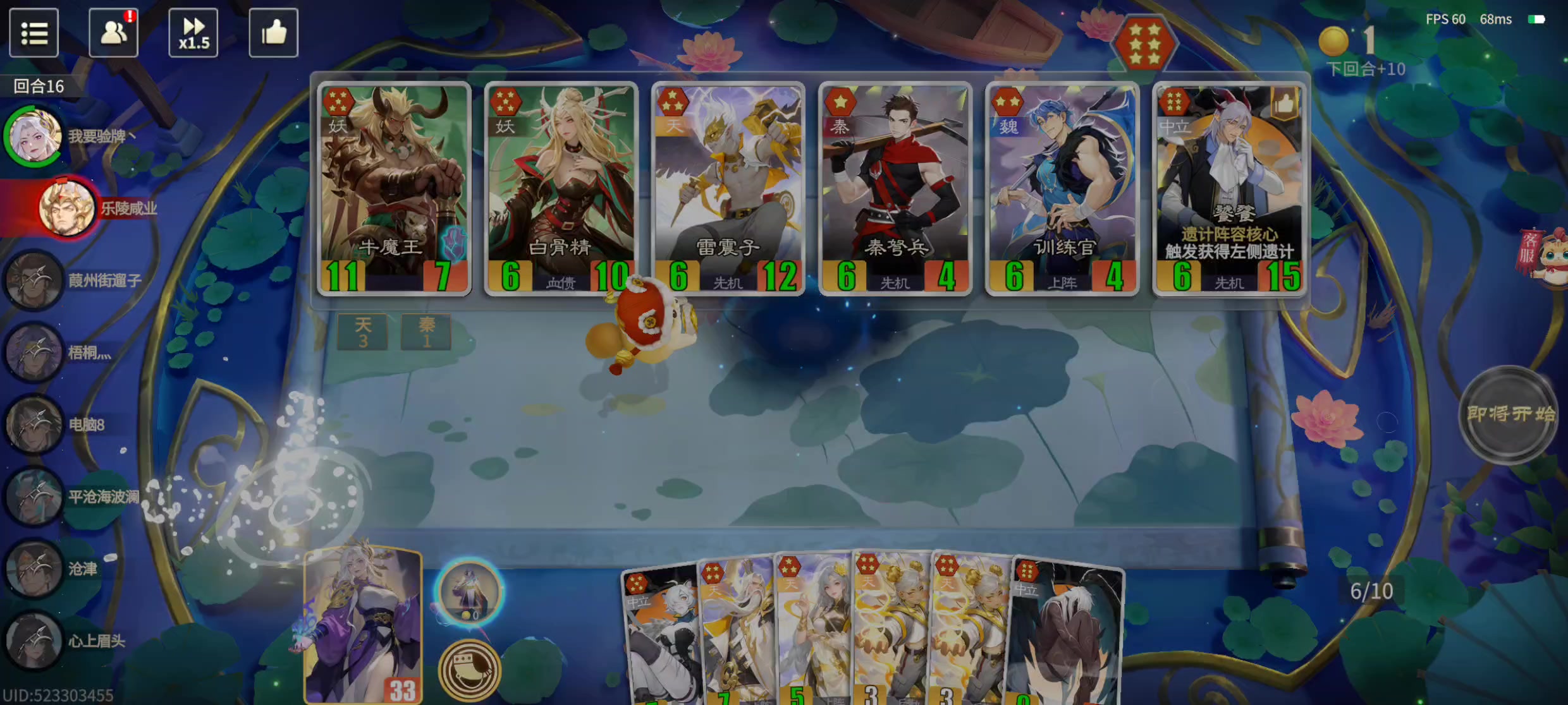“上阵哪吒” 操作简单,过渡强力,中后期压力直接拉满,伤害上限可以破万。几乎可以确定为是版本答案。 今天推荐一套整容,双核上阵天(雷震子+哪吒) 主要运营思路: 迅速升本,寻找雷震子、哪吒。大概7~8回合升至5本,之后不再上本。一般直到升本金额为0时再上六本。5本时,优先寻找加经济的牌(青龙、白虎、糜夫人、司马懿),其次朱雀、玄武(假如战力足够,只上朱雀、不上玄武,多发展经济)。决赛时,如果伤害不
