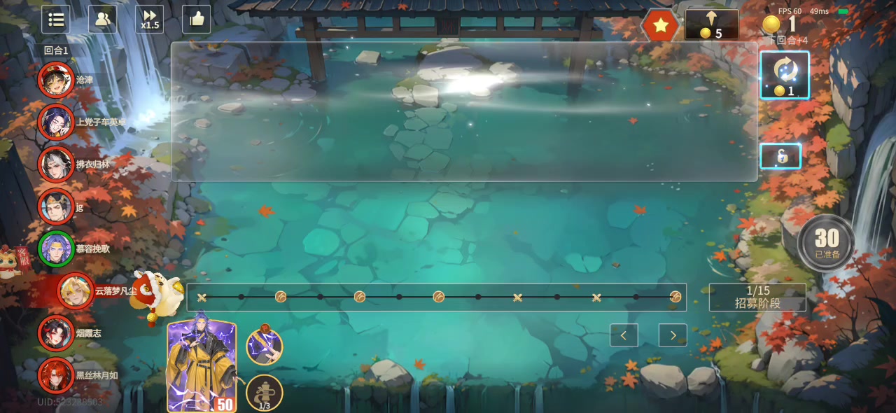 统帅名称:袁天罡统帅技能天机(主动):开局时,挑选一个势力,首次挑选部将时,所选部将势力与挑选势力相同,则技能变化为知天机,否则技能变化为守天机;4个回合后解锁:使用后获得一张四不像(3费,可使用次数1/1)知天机(主动 3费 可使用次数1/1):手牌中最左侧部将卡永久变为金色。守天机(主动 0费):选择一个友方部将,使其本回合获得截击和+x/+x(随商店等级提升)。设计想法缘由袁天罡