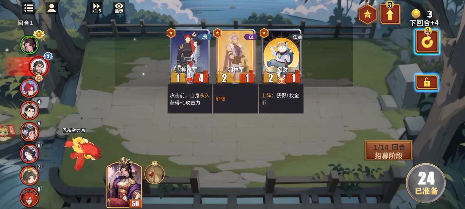 开局思路 因为金币过回合保留,所以金币用来升本的收益会远高于买垃圾低星部将,除了曹植外的所有统帅都需要快速升本。 第1回合:除了有需要配合的统帅开局买一个部将,其他统帅直接空过。 第2~5回合:能升本就升本,升四本之前打死不刷新,且最多买1张强战力三星部将或能很好配合英雄技能的部将,最晚第五回合升到四本。 第六回合:强势统帅直接升五本,对战完应该有30血以上。弱势统帅可以在停留一回合刷新一