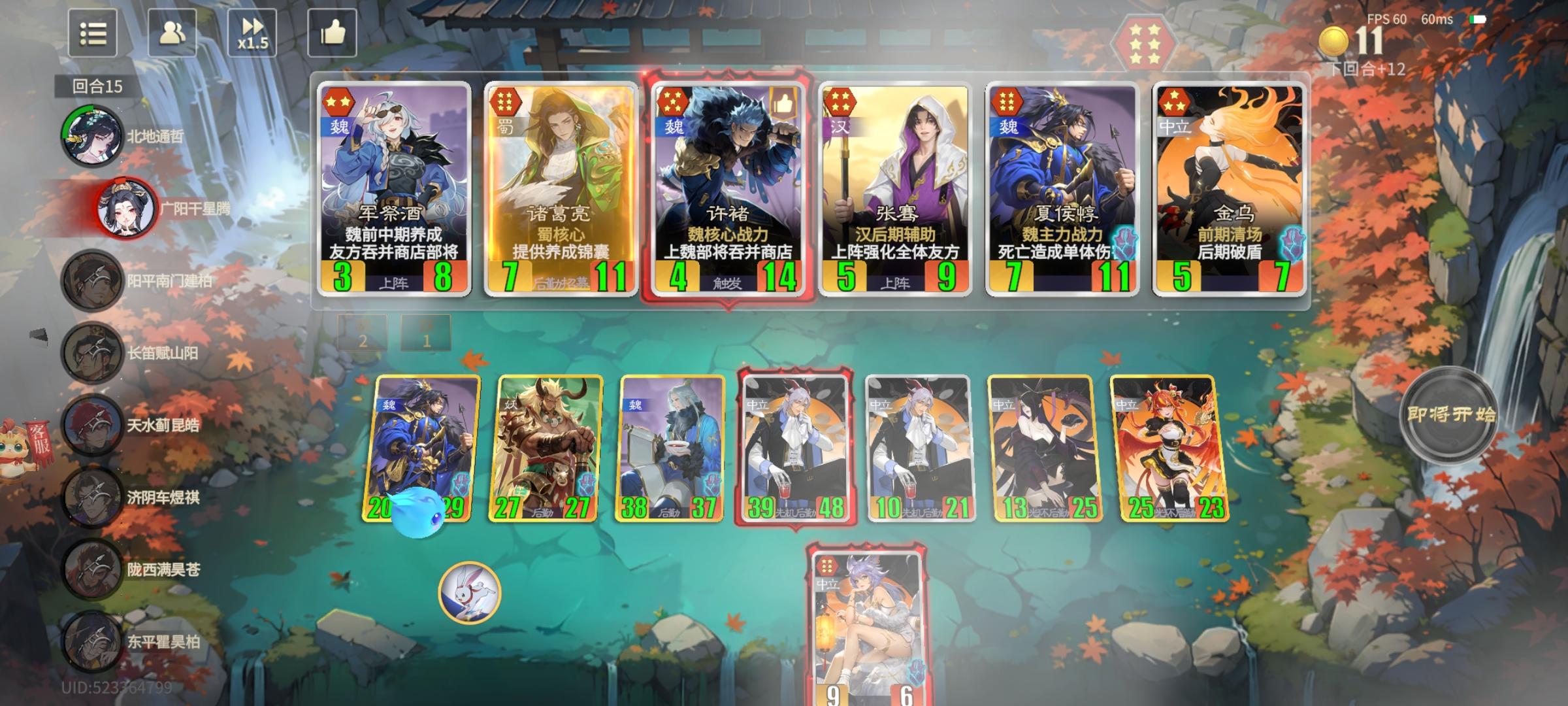 1.1先买招财获得一个金币,然后再买俩个羽林军。站位——羽林军 ,羽林军,招财1.2把招财卖掉,购买霍去病李广吕后卫子夫。站位——羽林军,羽林军,霍去病,吕后,卫子夫,李广。2.1购买张星彩,白毦兵,主公技能给甘夫人。站位——张星彩,白毦兵,甘夫人。2.2购买张飞,关羽,白虎,主公技能还是给甘夫人。站位——张飞,关羽,张星彩,白毦兵,甘夫人,白虎。2.3将锦囊全部丢给张飞