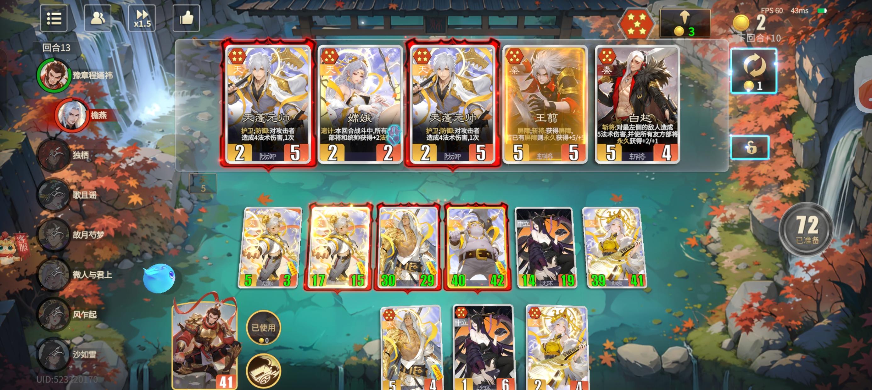 中立1.朱雀新增卡牌朱雀,效果为:友方部将先机效果触发2次(多个朱雀上场时,取最高效果),金则为3次。其他变化不大这个赛季新增一个阵营天,原本的黄巾天:1.电母新增加的部将,战斗开始时友方和统帅法强+1(对于张角来说前期不如霸波尔奔,尤其是第一回合)。2.巨灵神相比原本在黄巾时增加了一个,随机对1个敌人造成2点法术伤害,不错的加强。3.雷震子原本在黄巾时的遗技改为了先机,但是
