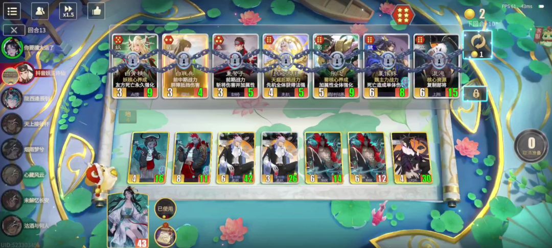 一开始凭借女娲技能拿到金赵公明,然后是朱雀,再然后是又一个金赵公明,猛猛搞钱。中后期就是搞搞上阵和搞托塔。到最后一回合,两个金雷震子都140法强左右,起手就是6*6*6*150,猛猛灌伤,笑不活了