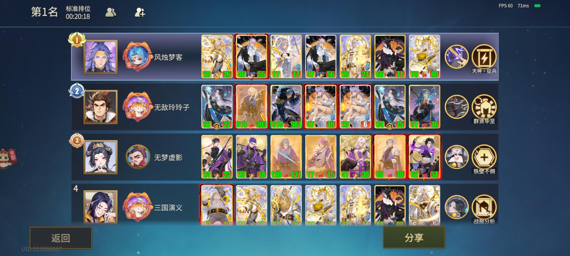 大秦迫击炮流(这套阵容比较难成型。基本都是5-6本卡)2.0版阵容没变,思路更加清晰了,附上胜率图(基本是一回合就完事了,感觉非常变态,大家早爽早完事)思路是速升5本拿白起+赵姬+朱雀。拿了一套基础白卡就冲6本完美阵容是白起+赵姬+白起+蒙恬+蒙恬+朱雀+那个啥月前期选强度牌如鱼玄机,太平公主,李斯,蒙毅,华阳夫人,还有吕不韦这套阵容主核心输出是蒙恬大将军。所以5本拿了