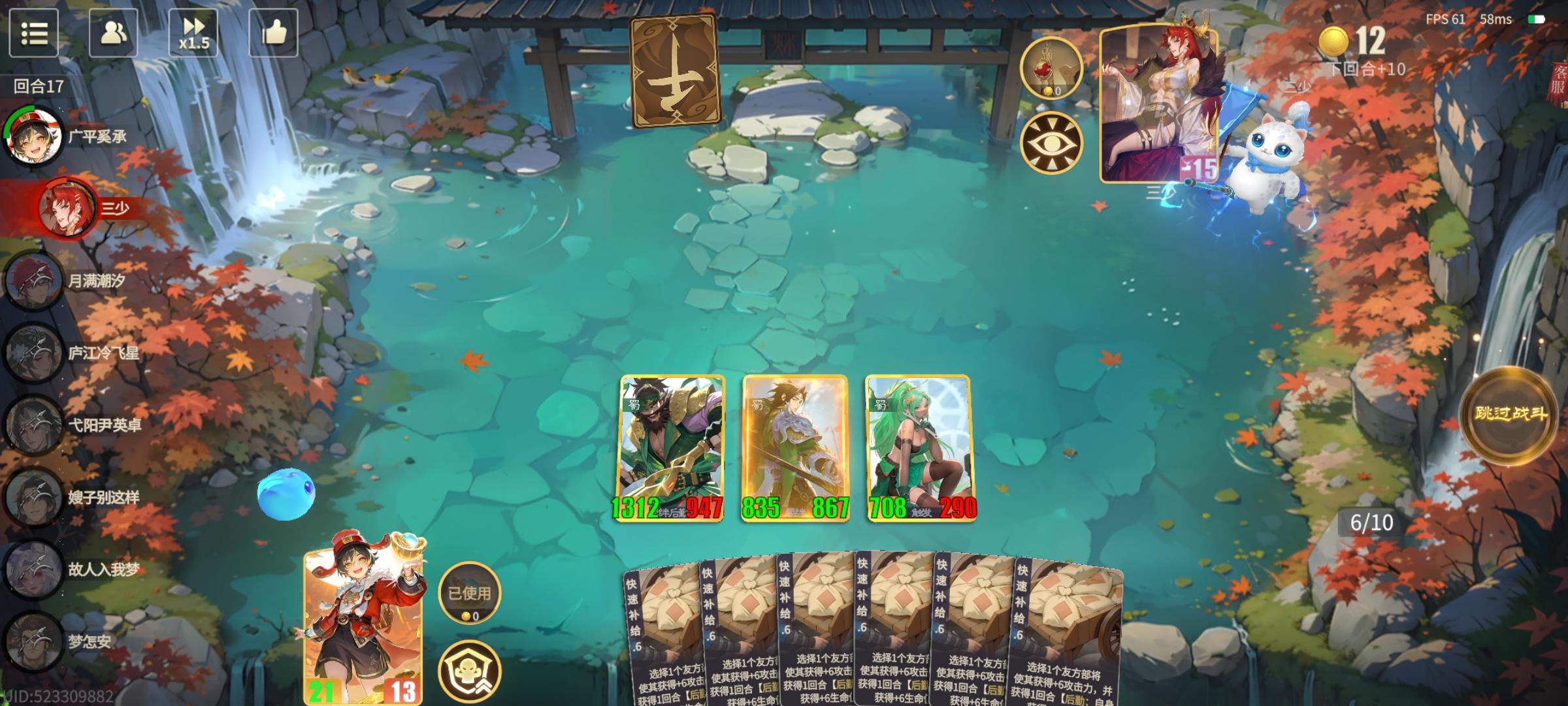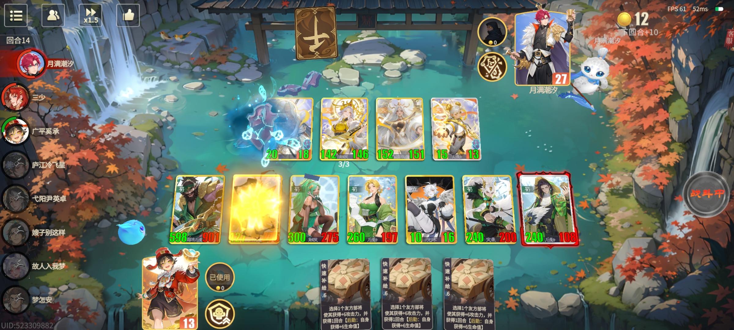 输了一把天内战,觉得曹植玩天有很大的空间。不一定非得曹植,但曹植稳定青龙,其余的拿不到战吼翻倍,玩天会很卡资源。天阵营,没有大哥,但频率高,稳定出手,伤害取决于频率跟法强,战吼翻倍,可以保证资源多一点,而且天阵营有两个上阵加法强,很搭。为什么不用唐的杨玉环来提高频率,论坛内另外一套是杨玉环天阵流,但那套很难把基础法强叠上来,而且缺资源,难成型。把杨玉环替换成九尾,不仅让天的资源更加充沛,而