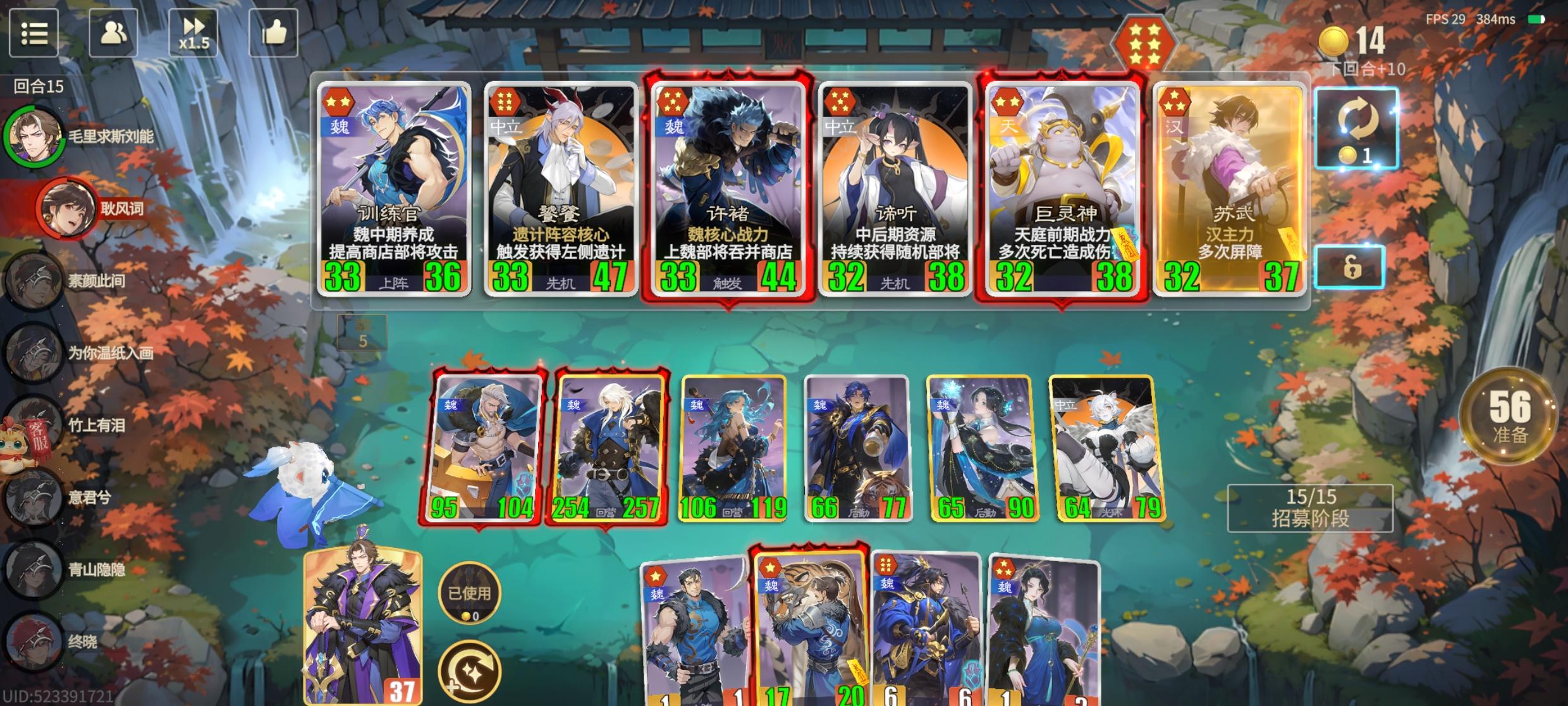实在是想吐槽下这个概率,打到第十五回合,很早就有了甄姬和白虎而且很快升金,每回合必得六张魏将+免费刷商店三次,还有收费刷的无数次,全程无人用魏,一般都遇不上的武将池独享+大吞吐量,就这愣是不给许褚,其他将基本全金了手牌都屯爆了几次就想屯着等许褚,我就服气了,最后一刷给我出来了有啥用🤣顺便一说荀彧也是前一回合才出来,这概率到底是咋算的还是真的就我手气这么背?
