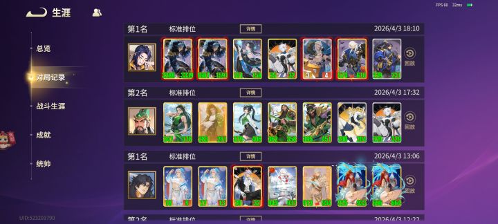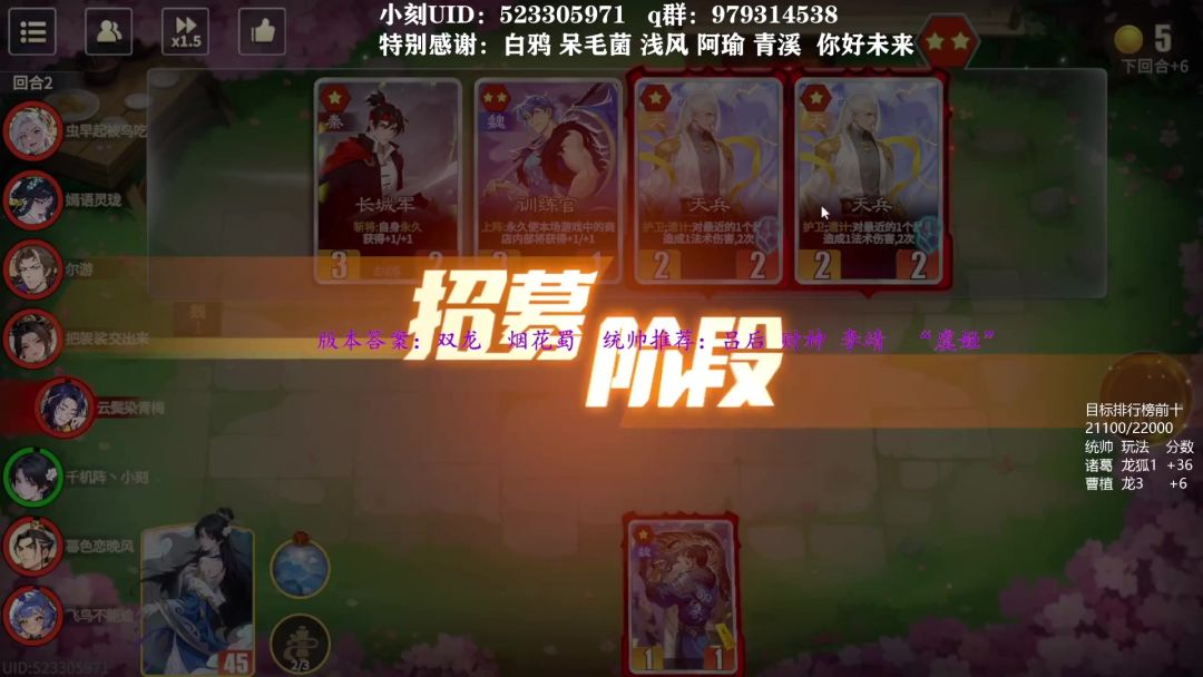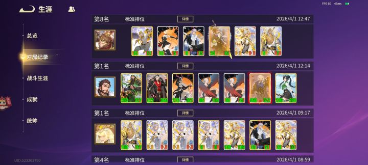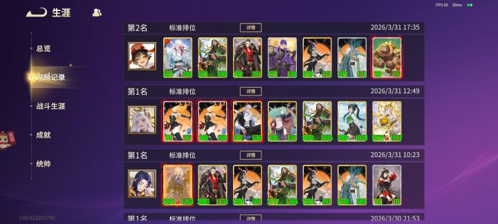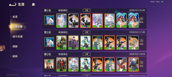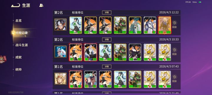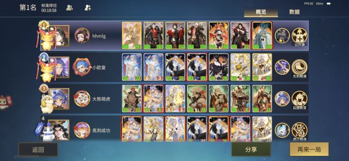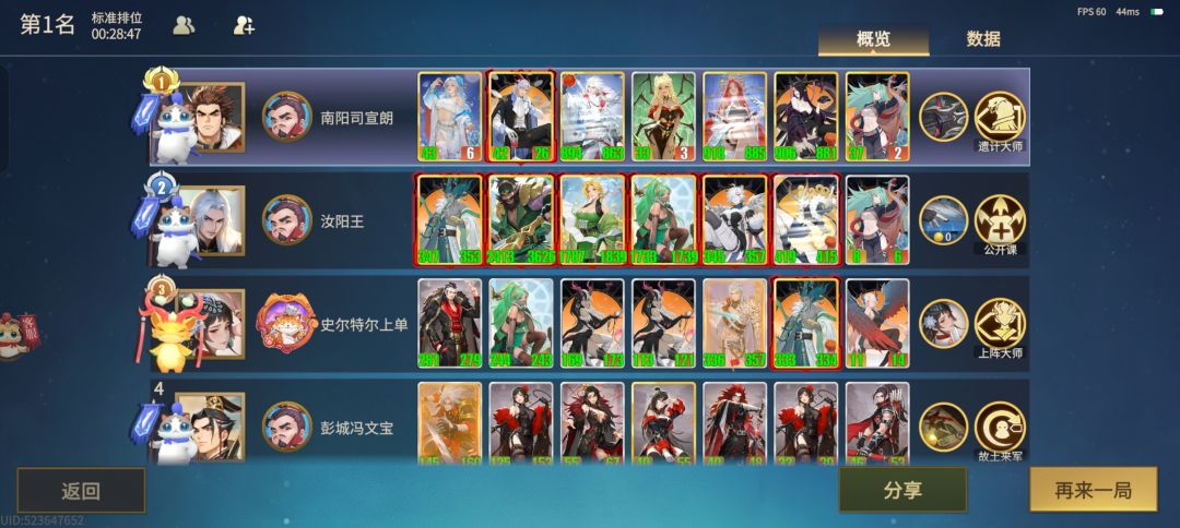 终于宗师了,算是勉强摸到高手门槛了吧期间停留最长的是钻石分段,当时不怎么会玩,基本每把都是第3第4,一把老8一天白玩。后面会玩了之后上分反而简单了不少。以下记录了最近20把的数据:平均名次2,登顶率50%,前四率95%(名次-统帅-阵容-谋略)1-曹植-后勤魏-魏征兵2-关羽-后勤蜀-先机精通1-项羽-跳操唐-遗计精通2-孙武-双龙会-寸有所长2-敖广-烟花蜀-上阵精通1-李靖-
