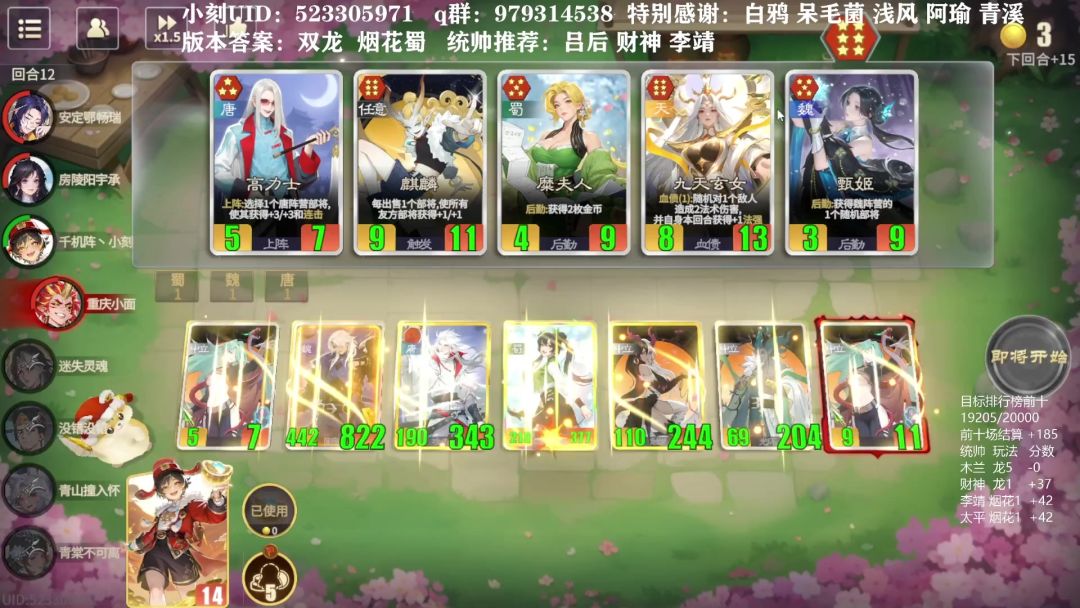 千机阵真的有一套阵容:9回合强度大于速攻秦国13回合成长大于全金蜀国14回合上限可大于后期魏国那就是无敌的烟花统帅首推王母、其次李靖、其次经济统帅必须要有天和蜀主要运营思路(王母为例)前期点两个青桃、一个黄桃,直接喂给部将稳定血量。然后进入红桃、青桃的循环。有妖可以点黄桃喂给金乌。前期买3~4个部将稳血量。7回合左右上五本凑阵容,凑齐即稳