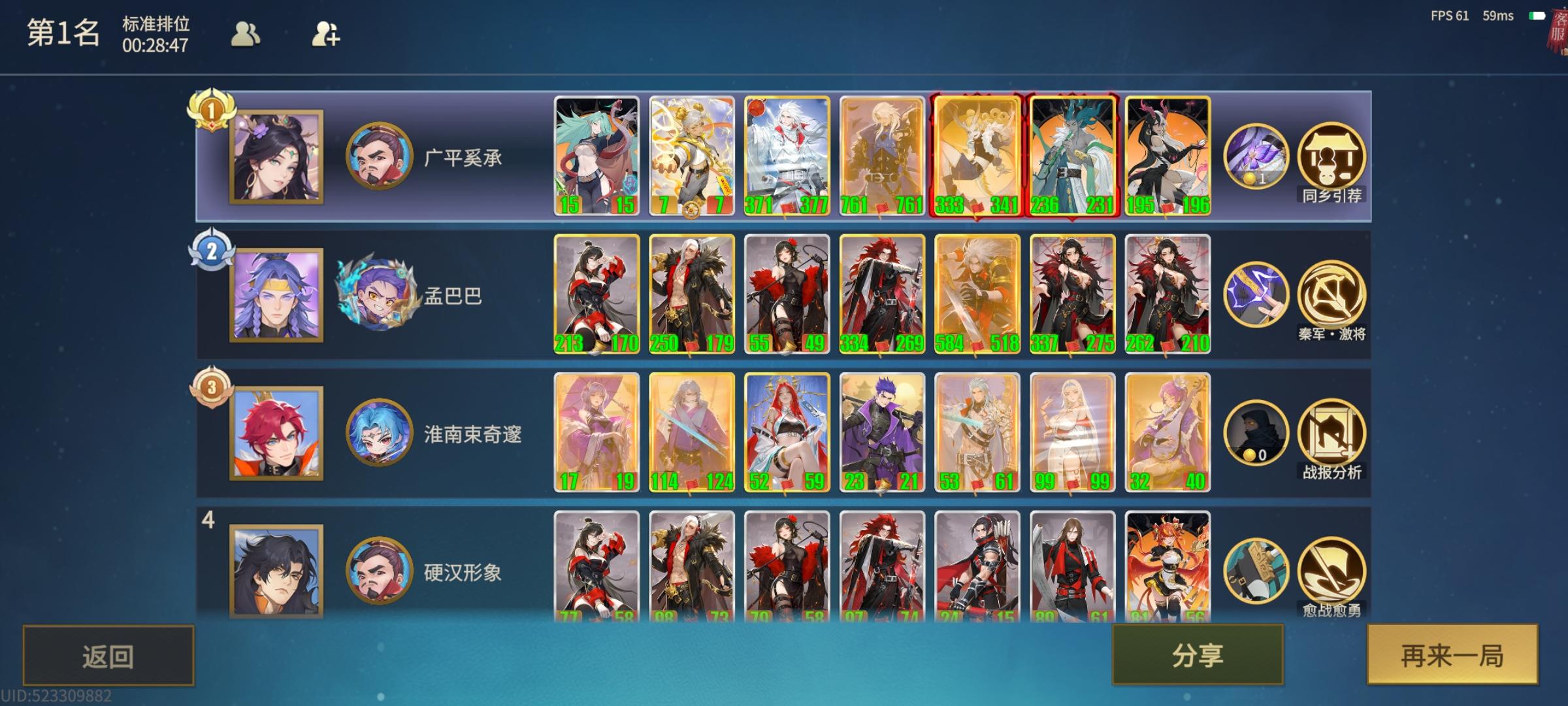 先说几个老阵营一、汉:荣光盾吴移植,牢秦最严厉的父亲,但相比盾吴,做了极大的加强,首先是霍去病(荣光孙策)增加了突袭效果,让汉不再是蹲坑打呆仗的呆瓜阵容,能够在先机阶段就打乱一些阵容的阵型。东方朔能够给汉角色永久加盾,让李广保底抗四下,化身不倒长城,比荣光周泰还能抗。还有赵云这个强力外援,在汉阵容中赵云身材能轻松破千,这是盾吴想都不敢想的事,这里说说吕后,很多人都不理解吕后这张卡的真正逻辑,这