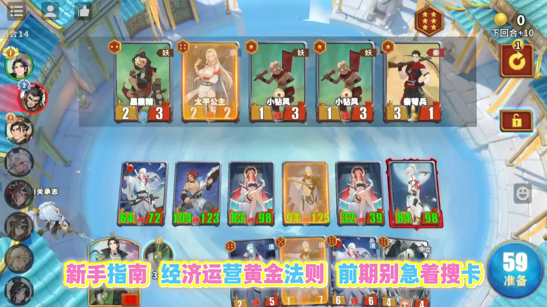 玩了两次内测,感觉这游戏运气占很重要一部份。然后是卡牌配合,最后才是主将技能。秦需要赵姬和毕月刷斩将,汉需要吕雉刷护盾,卫子夫加属性,唐要武则天和长孙无忌加属性,杨贵妃加攻击次数,妖要刷狐狸精的属性,蜀要张飞,诸葛亮,白虎等后期卡牌。所以前期卡牌什么强拿什么,五级之前几乎不用刷新,刷也找不到后期卡牌!刷到五级找到关键卡牌再组后期阵容。然后通过九尾,混沌,麒麟,白泽,徐庶,萧何等刷到心仪卡牌组阵。