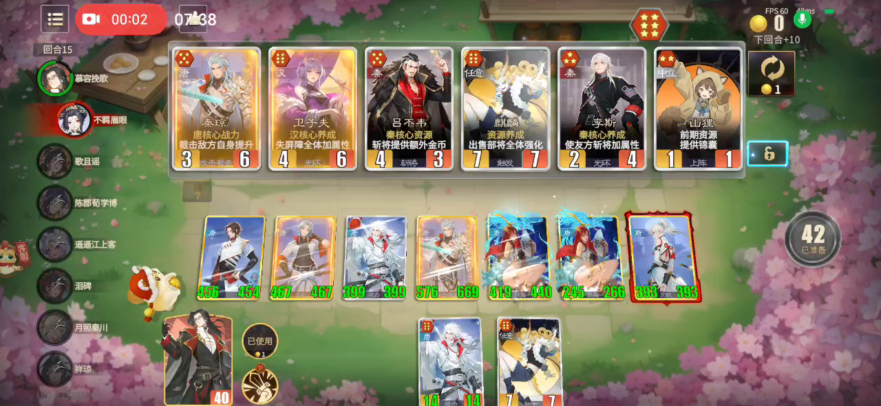 打了不少把了,有了些经验,给萌新玩家们说说,看着乐就行首先,这个游戏的组合很多,人人追求天胡,但,一些众所周知的事情就是,牌库是有限的,也就是说,同一张卡在牌库里的数目是一定的,所以很多都说“没有同行做起来不难”但这里有个小小的把戏。其他人可能没有同行,但不代表你不能当他们同行。速五可以打速攻,但速六最大的好处,是卡人。部分阵容第三回合就能判断大概,卡关键牌——比如诸葛亮,