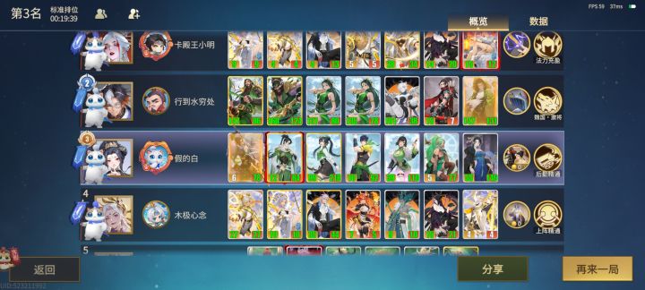 终于宗师了,算是勉强摸到高手门槛了吧期间停留最长的是钻石分段,当时不怎么会玩,基本每把都是第3第4,一把老8一天白玩。后面会玩了之后上分反而简单了不少。以下记录了最近20把的数据:平均名次2,登顶率50%,前四率95%(名次-统帅-阵容-谋略)1-曹植-后勤魏-魏征兵2-关羽-后勤蜀-先机精通1-项羽-跳操唐-遗计精通2-孙武-双龙会-寸有所长2-敖广-烟花蜀-上阵精通1-李靖-